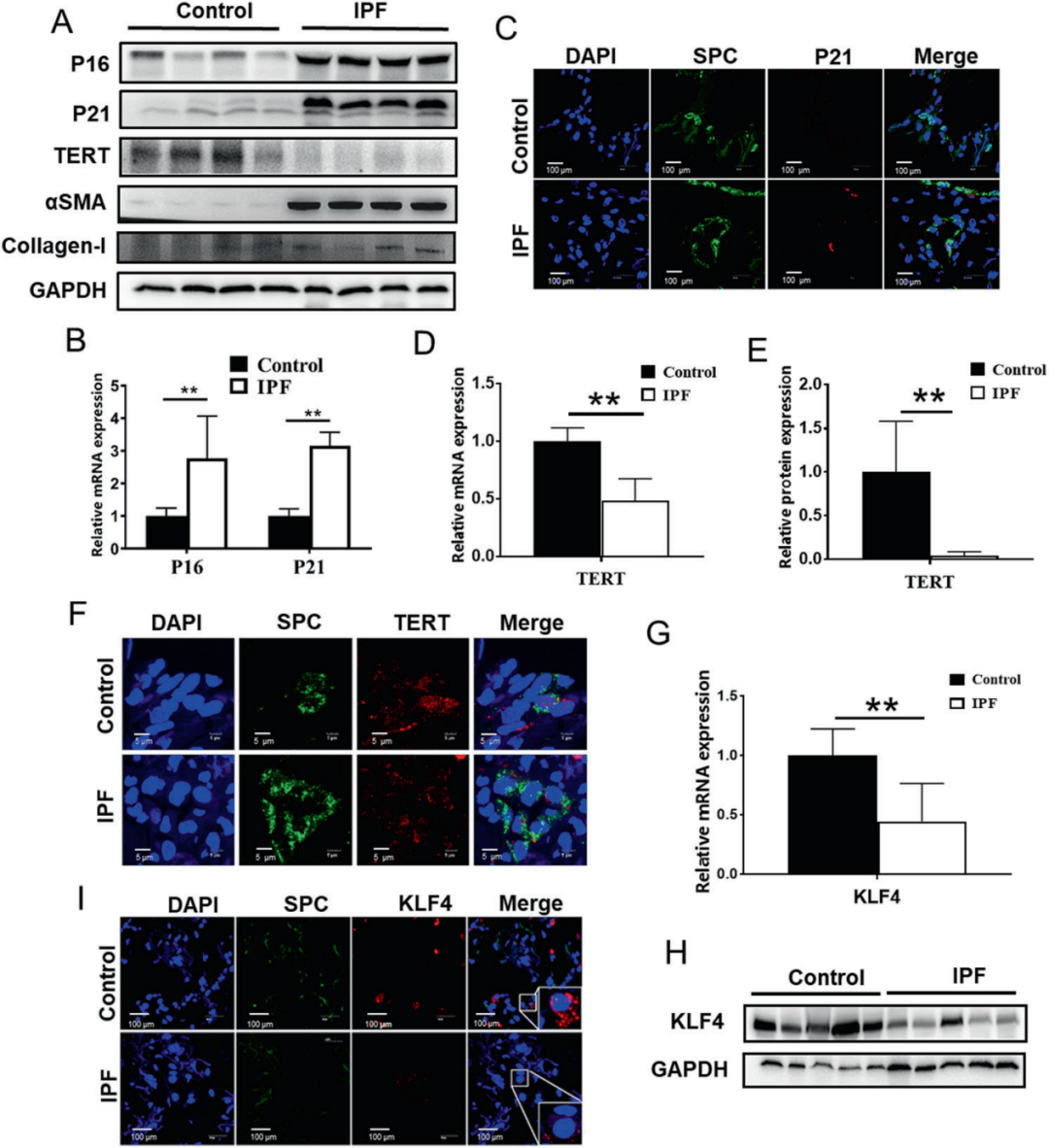 既往研究表明,IPF患者的AECs经历了衰老,衰老标志物如P16、P21在这些细胞中高表达。为确定IPF中的衰老标志物和TERT表达,作者获取了12例IPF患者(接受肺移植)和12例肺癌癌旁正常组织的肺组织切片进行Western Blot和qPCR检测。结果显示,IPF肺组织中P16、P21、α-SMA和Collagen-I的表达均显著升高,而TERT表达降低。采用双标免疫荧光染色评估AECs中P21的存在,分析了IPF组和肺癌癌旁正常组肺组织中SP-C(AECs的特异性标志物)和P21的表达水平。如下图所示,在IPF组检测到双染细胞,但在正常组中观察到极少量的双阳性细胞。类似地,免疫荧光也证实IPF组AECs中TERT表达下调。此外,与TERT表达一致,研究人员Western Blot和qPCR检测发现KLF4在IPF肺组织中的表达显著降低。免疫荧光染色也显示,IPF中AECs的KLF4表达降低。这表明,KLF4水平的降低可能在IPF患者AECs的衰老过程中扮演核心角色。