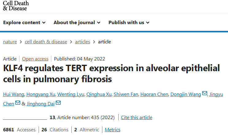 因此,南京大学医学院附属鼓楼医院代静泓主任医师、王东进主任医师联合南京医科大学附属无锡人民医院陈静瑜教授在Cell Death & Disease期刊发表了题为“KLF4 regulates TERT expression in alveolar epithelial cells in pulmonary fibrosis”的研究论文,作者假设KLF4可能调控AECs中TERT蛋白表达、端粒长度及端粒酶活性。该研究旨在阐明肺纤维化中AECs内TERT蛋白表达的调控机制。研究人员发现,在IPF患者和BLM诱导的小鼠模型的肺组织中,P16、P21及纤维化标志物(α-SMA和I型胶原)显著增加,而KLF4和TERT在AECs中的表达则降低。在体内实验中,研究者构建了由腺相关病毒AAV6载体介导、SP-C启动子(肺泡II型上皮细胞特异性)驱动的KLF4过表达体系。结果显示,在AECs中过表达KLF4能够保护TERT的表达,并抑制BLM诱导的小鼠模型中肺纤维化的发展。在探索TERT调控机制时,作者发现KLF4和TERT在BLM诱导衰老的MLE-12细胞(小鼠肺泡II型上皮细胞,常用的永生化肺上皮细胞系)中均下调。与对照组相比,靶向KLF4的小干扰RNA(siRNA)显著降低了TERT表达并诱导细胞衰老。此外,MLE-12细胞中染色质免疫沉淀(ChIP)实验表明,KLF4能够结合到TERT启动子区域,这提示KLF4可能通过调控AECs中TERT的转录而参与肺纤维化的发病机制。综上所述,本研究确定KLF4可能是一个具有前景的潜在靶点,有助于进一步理解IPF的机制并开发新的治疗策略。