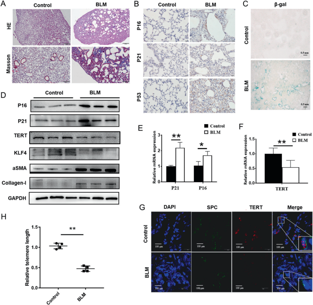 图2.BLM诱导的小鼠肺组织中TERT和KLF4表达降低