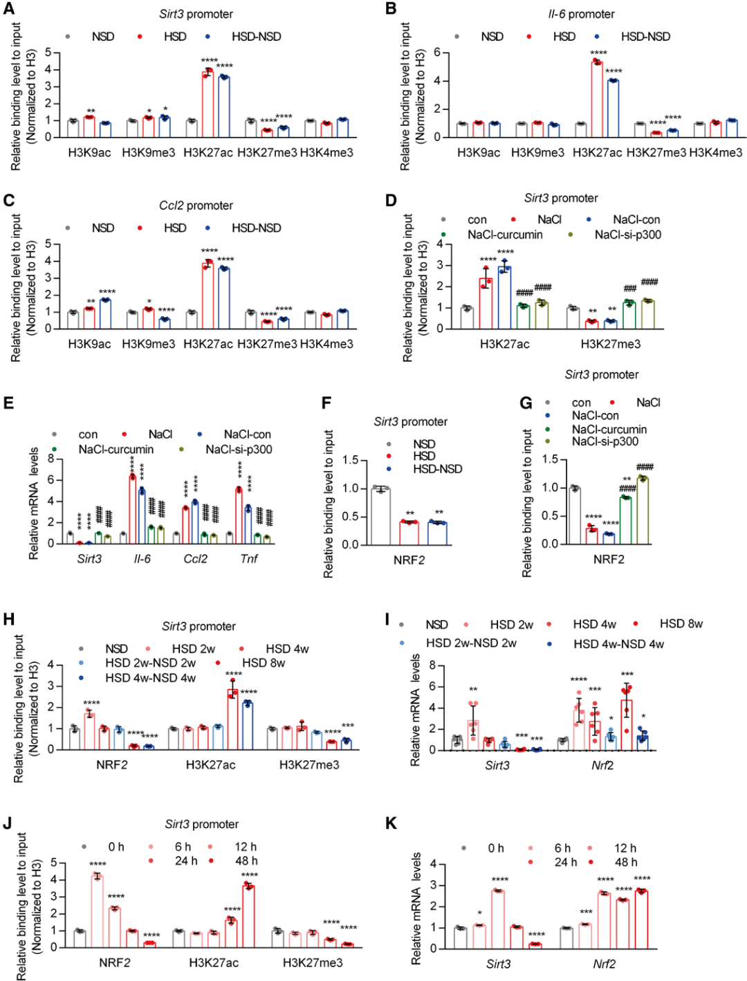 然而,为何H3K27ac对SIRT3表达的影响与对促炎因子的影响相反?作者重新分析了Sirt3基因的启动子区域,发现其中存在NRF2(核因子E2相关因子2)的结合位点——NRF2是SIRT3的正向调控因子。实验发现,HSD显著抑制了肝组织中NRF2与Sirt3启动子区域的结合,且这种抑制在改用NSD后仍持续存在。重要的是,敲低或抑制p300恢复了高盐导致的NRF2与Sirt3启动子结合水平的降低,这表明H3K27ac水平升高可能降低了NRF2的结合能力。此外,2周的HSD显著刺激了小鼠肝脏中NRF2与SIRT3启动子的结合水平,同时伴随SIRT3的短暂高表达。但随着时间推移,NRF2的结合减少,而H3K27ac逐渐增加,同时SIRT3的表达降低。此外,NRF2的表达依赖于HSD的存在,因为在高盐去除后其表达恢复正常。SIRT3的表达先升高后下降,几乎与其启动子上NRF2的结合水平一致。因此,这些结果表明,H3K27ac对NRF2结合的抑制作用,是高盐去除后SIRT3表达持续降低的主要原因。