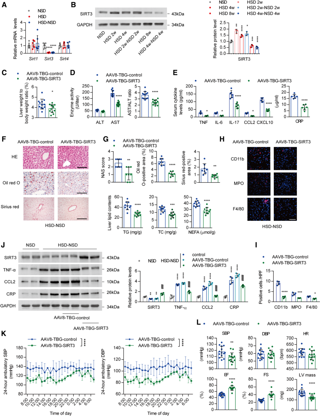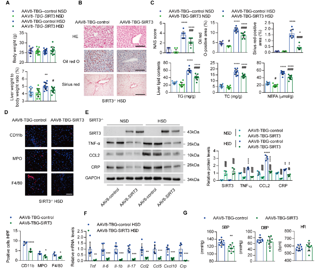 随后,作者通过给SIRT3-/-小鼠注射AAV8-TBG-SIRT3,评估了SIRT3对HSD诱导的肝脏炎症的保护作用。结果显示,恢复SIRT3的表达显著降低了HSD喂养的SIRT3-/-小鼠的肝重与体重比值。与注射对照载体的小鼠相比,注射AAV8-TBG-SIRT3的SIRT3-/-小鼠的肝脂肪变性、脂质蓄积、纤维化及炎症细胞浸润均显著减轻。基因表达分析还表明,在SIRT3-/-小鼠中过表达SIRT3不仅直接降低了促炎细胞因子的高表达水平,还阻断了HSD对其的促进作用。肝脏中SIRT3的过表达也降低了SIRT3-/-小鼠中盐诱导的收缩压升高。