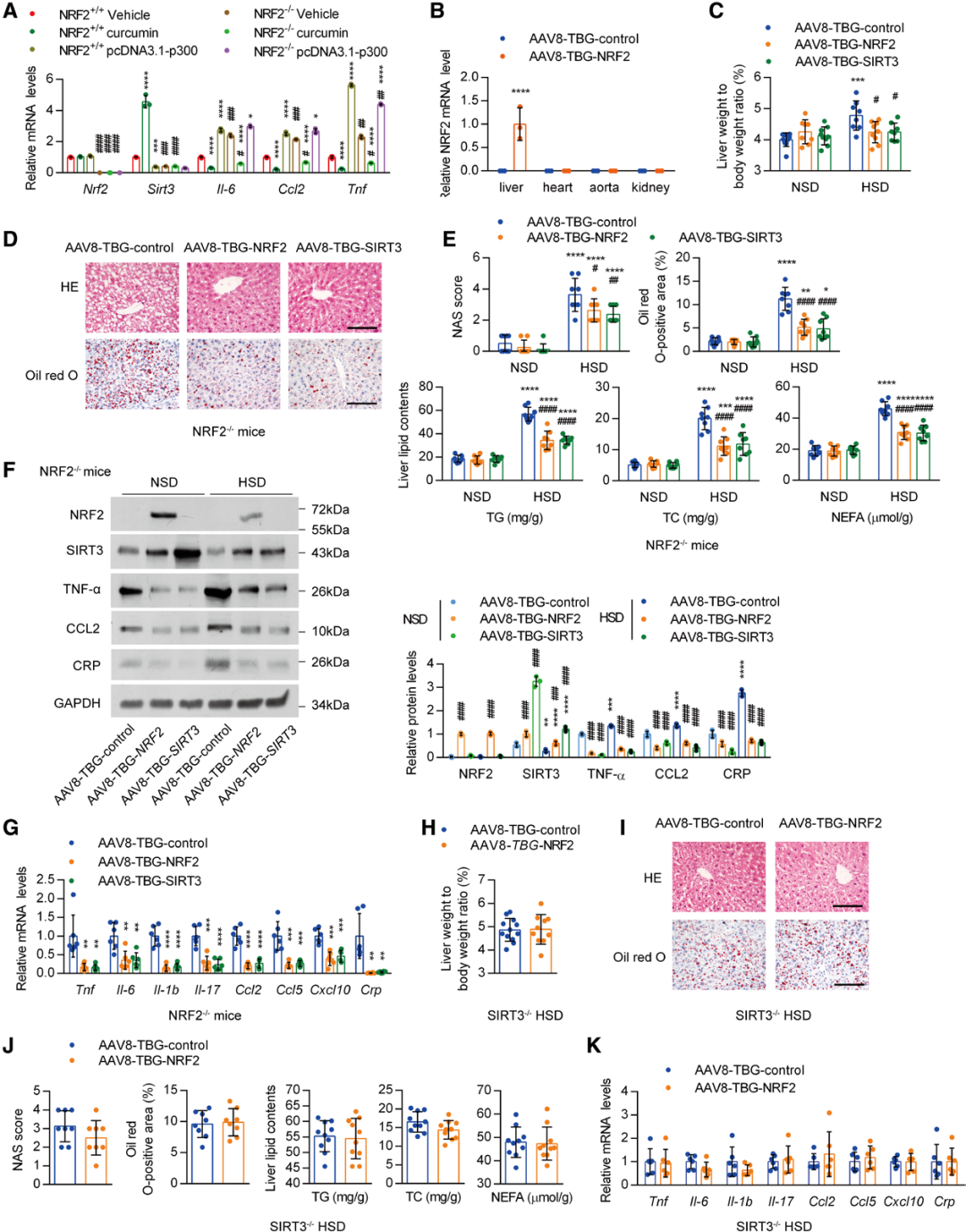 因此,为证实SIRT3的抑制是否介导了NRF2敲除加剧肝脏炎症的作用,研究人员给NRF2-/-小鼠分别注射了AAV8-TBG-SIRT3、AAV8-TBG-NRF2和对照载体。AAV8-TBG-NRF2在肝脏中的特异性也得到了验证。与AAV8-TBG-NRF2类似,恢复肝脏中SIRT3的表达也显著阻断了NRF2敲除对HSD诱导的肝损伤的促进作用。此外,SIRT3过表达还改善了HSD喂养的NRF2-/-小鼠肝脏中促炎细胞因子编码基因的高表达。相反,在HSD喂养的SIRT3-/-小鼠肝脏中过表达NRF2,发现AAV8-TBG-NRF2无法减轻小鼠的肝脂肪变性和脂质蓄积。两组小鼠的炎症基因表达也无差异。这些结果表明,作为NRF2的下游靶标,SIRT3表达的抑制是NRF2敲除促进肝脏炎症的主要原因,且NRF2的肝脏保护作用需要SIRT3的参与。