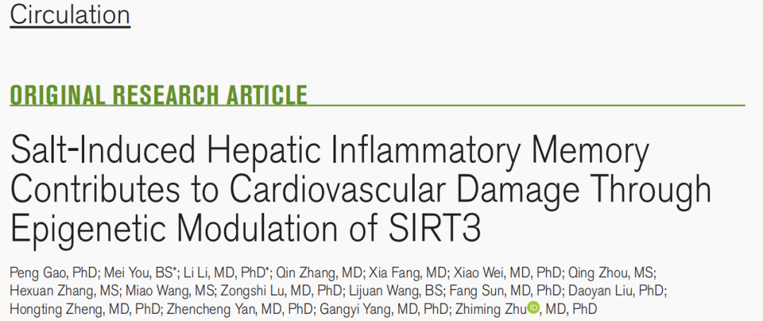 陆军军医大学陆军特色医学中心(大坪医院)祝之明主任医师课题组在Circulation期刊(IF=29.69)发表题为“Salt-Induced Hepatic Inflammatory Memory Contributes to Cardiovascular Damage Through Epigenetic Modulation of SIRT3”研究论文。该研究旨在探讨高盐饮食(HSD)诱导的肝脂肪变性是否是心血管损伤的主要原因,及其潜在机制。研究发现,肝脏中SIRT3表达降低是盐诱导的肝脏炎症和脂肪变性的重要介导因子。HSD通过表观遗传修饰机制抑制SIRT3的转录,导致肝脏炎症持续存在。值得注意的是,利用腺相关病毒8型(AAV8)载体在肝脏中过表达SIRT3有效缓解了小鼠持续性肝损伤的进展,从而对抗盐诱导的心血管损伤。综上所述,该研究结果表明,通过抑制肝脏慢性持续性炎症状态,有望为盐诱导的心血管损伤提供一种有效的治疗方法。