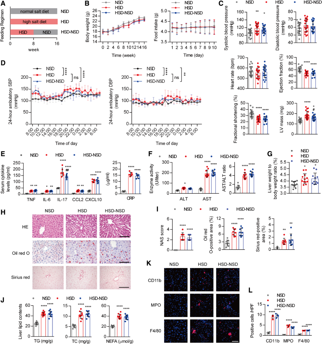 小鼠的干预过程和分组情况如图所示。三组小鼠的体重和食物摄入量无显著差异。高盐饮食(8%盐,HSD)显著升高收缩压,但不影响心率(HR);同时,心脏功能明显受损,表现为射血分数(EF)和短轴缩短率(FS)降低。此外,高盐摄入还显著提高了血清中促炎标志物(肿瘤坏死因子TNF、IL-6、IL-17、C-C基序趋化因子配体2/CCL2C-X-C基序趋化因子配体10/CXCL10及C反应蛋白/CRP)的水平。HSD使血清丙氨酸氨基转移酶(ALT)和天门冬氨酸氨基转移酶(AST)浓度(酶活)升高,并导致AST与ALT的比值上升。相应地,HSD喂养的小鼠肝重与体重的比值也更高。令人惊讶的是,停止高盐摄入后,全身性炎症和肝损伤均未恢复至正常水平,这表明存在持续性肝损伤。同样,盐诱导的高血压和心脏功能障碍在高盐摄入停止后仍较严重。此外,HSD还刺激了肝脏中的脂质蓄积、脂肪变性和纤维化,并使甘油三酯(TG)、总胆固醇(TC)和非酯化脂肪酸(NEFA)水平升高;HSD喂养的小鼠肝脏内有更多的中性粒细胞和巨噬细胞浸润。然而,改用正常盐饮食(0.4%盐,NSD)仍无法缓解这些肝脏病理变化。HSD导致炎症和纤维化相关基因的表达显著增加,而停止高盐摄入并未影响这些基因的表达。这些结果表明,高盐诱导的肝损伤具有“记忆”特征。