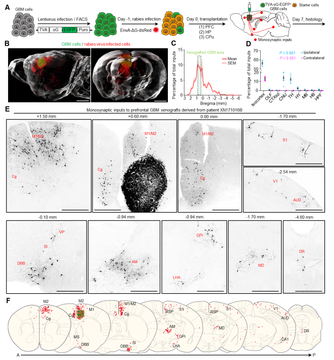 胶质母细胞瘤(Glioblastoma multiforme,GBM)是最致命的原发性脑肿瘤,与许多其他恶性肿瘤不同,GBM的侵袭主要局限于中枢神经系统内,这凸显了“神经环境”对其生存和进展的关键作用。研究表明,GBM并非被动占据空间,而是作为神经环路的积极参与者,胶质瘤细胞与神经元进行复杂的相互作用来促进肿瘤生长。然而,神经元-胶质瘤细胞全脑连接网络,特别是与远距离神经元和多种神经递质系统的连接,目前仍知之甚少。