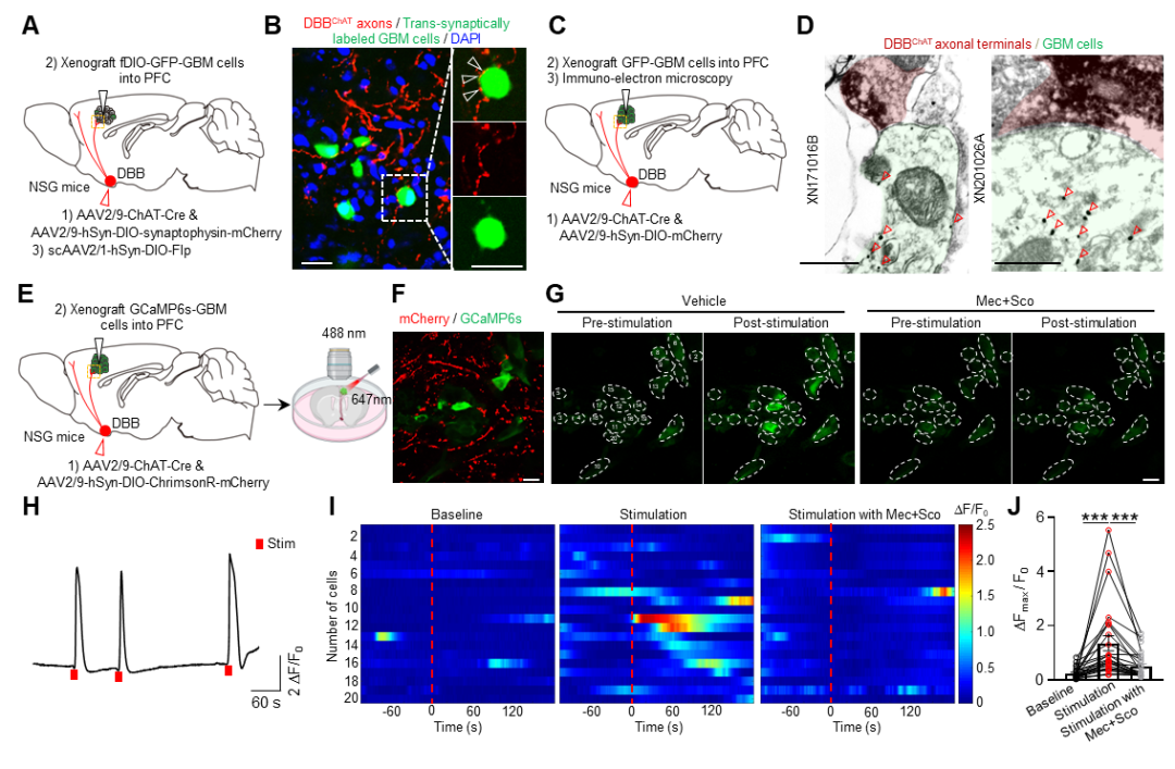 图2:胶质瘤细胞与上游胆碱能神经元之间突触连接及功能鉴定