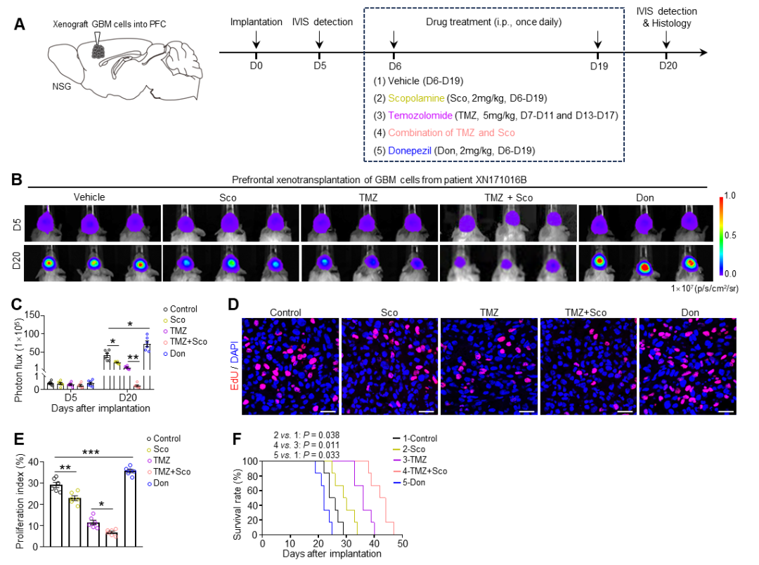 在临床应用探索方面,研究团队发现临床常用药物、具有“老药新用”潜力的M受体抑制剂东莨菪碱,在胶质瘤模型小鼠中能够抑制GBM进展,并增强替莫唑胺的化疗效果。然而,研究同时提示,常用乙酰胆碱酯酶抑制剂多奈哌齐可能加速GBM进展,这提示临床需重新评估此类药物在胶质瘤患者中的用药风险。