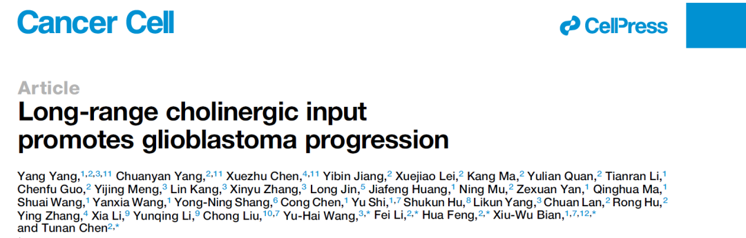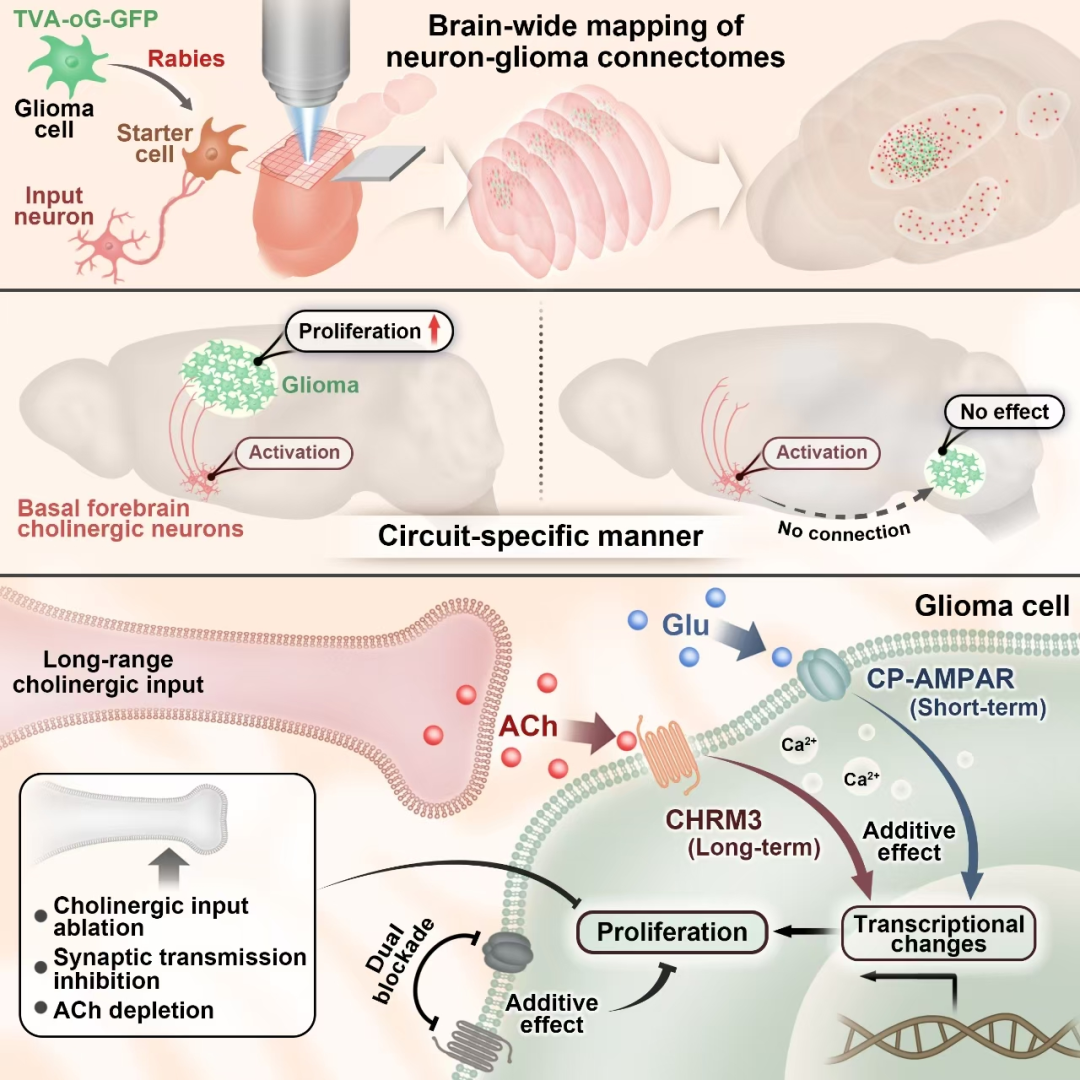 近日,来自陆军军医大学西南医院病理科、脑胶质瘤医学研究中心卞修武院士,联合西南医院神经外科、脑胶质瘤医学研究中心陈图南教授/冯华教授/李飞教授,以及联勤保障部队第904医院神经外科王玉海教授,在Cancer Cell杂志(IF=44.5)在线发表了题为“Long-range Cholinergic Input Promotes Glioblastoma Progression”的研究论文。该研究系统描绘了神经元-胶质瘤细胞的全脑连接图谱,并深入解析了远距离胆碱能输入对GBM进展的影响,为“癌症神经科学”(Cancer Neuroscience)研究提供了新范式,并为GBM治疗开辟了新靶点。