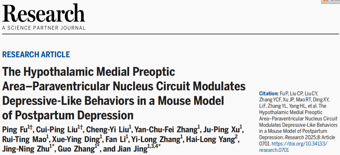 2025年5月14日,南京大学生命科学学院景键教授、张果教授和朱景宁教授团队合作在Research期刊发表标题为The Hypothalamic Medial Preoptic Area-Paraventricular Nucleus Circuit Modulates Depressive-Like Behaviors in a Mouse Model of Postpartum Depression的研究论文。该研究表明,MPOAGABA神经元向PVN存在密集投射。在HW小鼠中,激活投射到PVN的MPOAGABA神经元可缓解抑郁样行为。相反,在非激素撤退(NHW)对照小鼠中(继续接受雌激素处理),抑制这些靶向PVN的MPOAGABA神经元会加剧抑郁样行为。进一步实验和分析发现,在HW小鼠模型中,AVP是该通路中的关键神经肽。在HW小鼠中化学遗传学抑制PVNAVP神经元可减轻抑郁样行为,而在NHW小鼠中激活这些神经元会加重这些行为。电生理记录显示,MPOAGABA神经元可直接抑制PVNAVP神经元。综上所述,这些发现表明,在NHW小鼠中,MPOAGABA神经元对PVNAVP神经元具有抑制性控制作用,而MPOAGABA神经元活性降低则会导致HW小鼠出现抑郁样行为。这凸显了MPOAGABA-PVNAVP环路在小鼠模型PPD病理生理过程中的关键作用。靶向这一环路可能为PPD提供一种新的治疗策略。