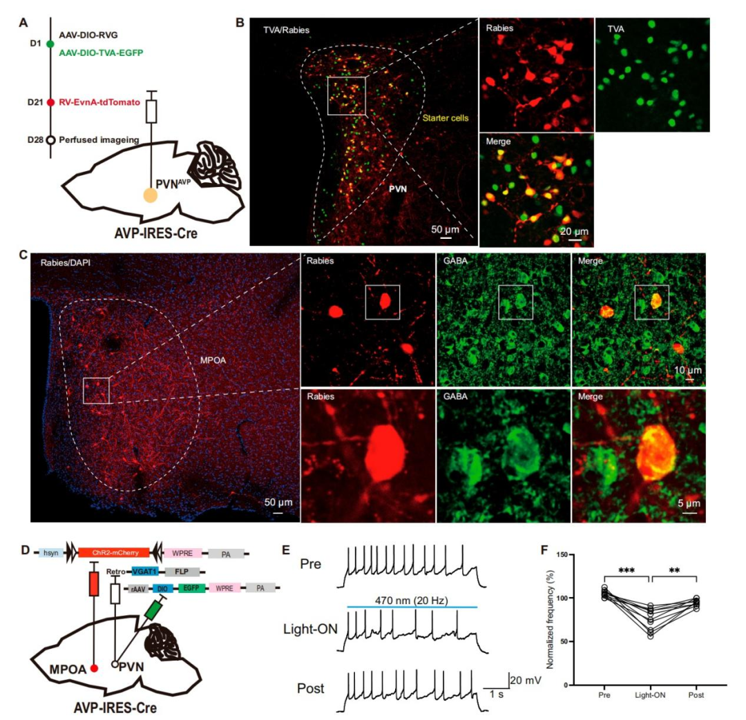 前述研究结果表明,投射至PVN的MPOAGABA神经元与接受MPOA输入的PVNAVP神经元在调节抑郁样行为中发挥相反作用,这提示MPOAGABA神经元可能通过抑制PVNAVP神经元来发挥其效应。为验证这一假设,研究人员采用狂犬病病毒(RV)介导的逆行跨单突触示踪技术,绘制PVNAVP神经元的单突触输入图谱。具体而言,向AVP-IRES-Cre小鼠的单侧PVN立体定位注射Cre依赖的AAV辅助病毒[rAAV-EF1α-DIO-H2B-EGFP-T2A-TVA和rAAV-EF1α-DIO-RVG]。21天后,将RV-CVS-ENVA-N2C(ΔG)-tdTomato注射到同一PVN位点。7天后,处死小鼠进行免疫组织化学分析。通过PVN中EGFP和tdTomato信号的存在,证实起始细胞标记成功。研究者发现多个同侧脑区向PVNAVP神经元发出直接投射,其中显著的输入来自MPOA、终纹床核(BNST)、未定带(ZI)和PAG。重要的是,这些MPOA传入神经元中,有相当一部分共表达GABA,表明PVNAVP神经元接受来自MPOAGABA神经元的单突触输入。