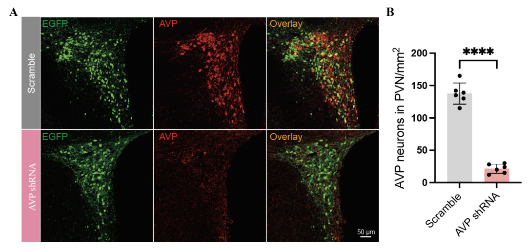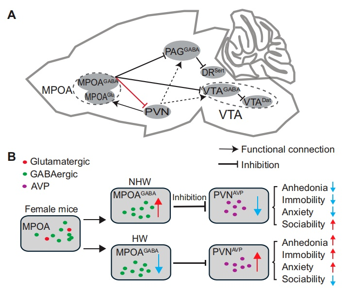 在PVN内,精氨酸加压素(AVP)神经元是一个关键群体,参与调节多种生理和行为功能,包括睡眠、进食、自我修饰、筑巢、社会探究和攻击行为。此外,PVNAVP神经元还与应激反应有关,先前的研究发现抑郁症患者和大鼠的PVN中AVP阳性神经元数量增加。研究表明,敲除AVP基因可提高蔗糖偏好度并减少强迫游泳实验(FST)中的不动时间,这提示AVP在调节抑郁样行为中可能发挥作用。值得注意的是,一项临床研究表明AVP可能与产后抑郁症有关。尽管有这些见解,但AVP调节抑郁样行为(尤其是与生殖激素波动相关的抑郁样行为)的具体环路机制在很大程度上仍属未知领域。