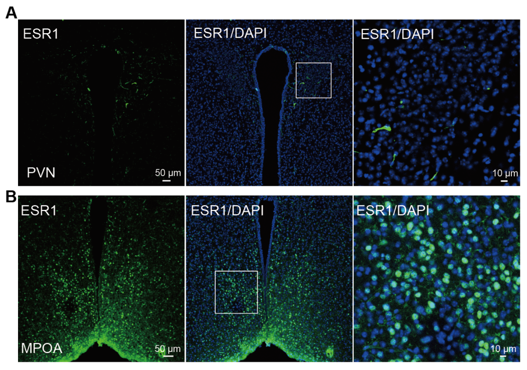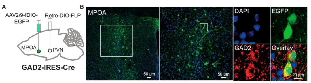 先前的研究已发现,表达ESR1的MPOA神经元会投射至PVN,且这些MPOA神经元中有相当一部分是GABA能神经元。基于这些发现,作者推测MPOAGABA神经元可能支配PVN。为验证这一点,向GAD2-IRES-Cre小鼠的PVN注射了rAAV2/R-EF1α-DIO-FLP-WPRE,随后向其MPOA注射了rAAV-hSyn-fDIO-EGFP-WPREs。三周后,逆行标记结果证实MPOAGABA神经元投射至PVN。