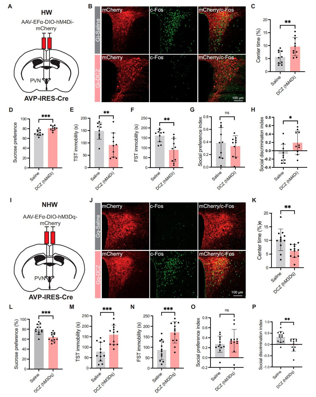 基于PVNAVP神经元在HW小鼠中表现出更高的激活水平,研究者推测这些神经元的活动增强可能是导致HW小鼠出现抑郁样行为的原因之一。为验证这一假设,采用化学遗传学方法选择性操控PVNAVP神经元。具体而言,向AVP-IRES-Cre小鼠的PVN内注射了编码hM4Di和hM3Dq受体的Cre依赖的AAV载体,这些载体可选择性靶向AVP神经元。三周后,通过给予DCZ,实现对PVNAVP神经元的化学遗传学沉默或激活。结果显示,DCZ注射后,HW小鼠的抑郁样行为显著减轻。这些改善表现为:在OFT中处于中央区域的时间增加,蔗糖偏好度提高,在TST和FST中的不动时间减少,同时社交辨别能力得到改善,而社交偏好未发生变化。相反,对NHW小鼠的PVNAVP神经元进行化学遗传学激活,导致抑郁样行为加剧。有趣的是,在未接受激素处理的正常雌性小鼠中,化学遗传学操控并未影响其抑郁样行为。这表明,PVNAVP神经元对行为的影响依赖于激素波动。综合来看,在HW条件下,PVNAVP神经元激活会特异性加剧抑郁样行为。