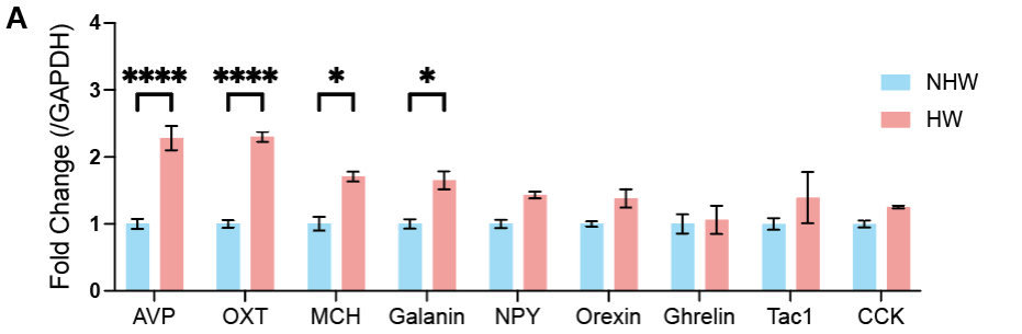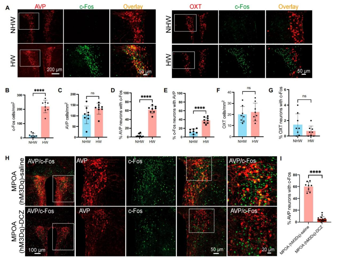 尽管上述证据表明,激活MPOAGABA-PVN环路减少了HW小鼠的抑郁样行为,但所涉及的PVN神经元具体类型尚不明确。由于PVN神经元会表达神经肽,作者尝试确定PVN内与抑郁样行为相关的神经肽信号。首先,通过qPCR检测了下丘脑PVN区域中神经肽的表达情况。结果显示,HW组的催产素(OXT)和AVP表达水平升高,这提示它们可能在HW相关的抑郁样行为中发挥作用。随后,通过神经元活性标志物c-Fos免疫染色检测了HW小鼠中AVP和OXT神经元的激活水平。研究发现,与NHW对照组相比,HW处理小鼠的PVN神经元激活水平升高。值得一提的是,与NHW组比较,HW小鼠PVN中较高比例的AVP表达神经元激活水平升高,但两组AVP阳性神经元的总数无显著统计学差异。另外,两组小鼠的OXT表达神经元数量及其激活比例均无显著统计学差异。除此以外,在下丘脑视上核(SON,已知AVP和OXT高表达的区域)中,HW和NHW小鼠的AVP及OXT神经元激活水平未观察到显著差异。综上,这些数据表明,HW小鼠中PVNAVP神经元(而非PVNOXT神经元)的特异性激活可能参与了抑郁样行为的表达,提示这些神经元在情绪调节中具有功能性作用。