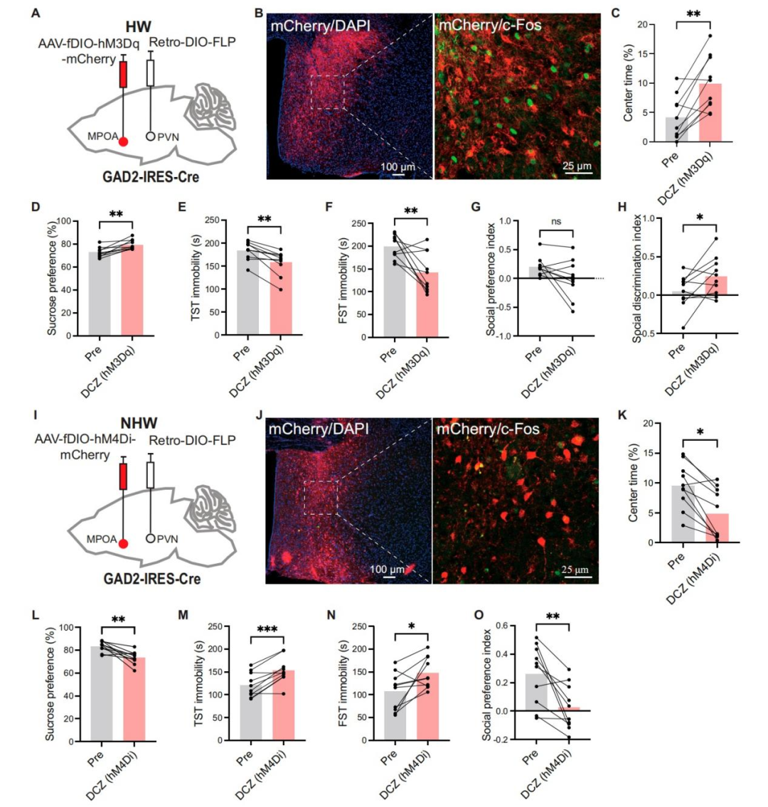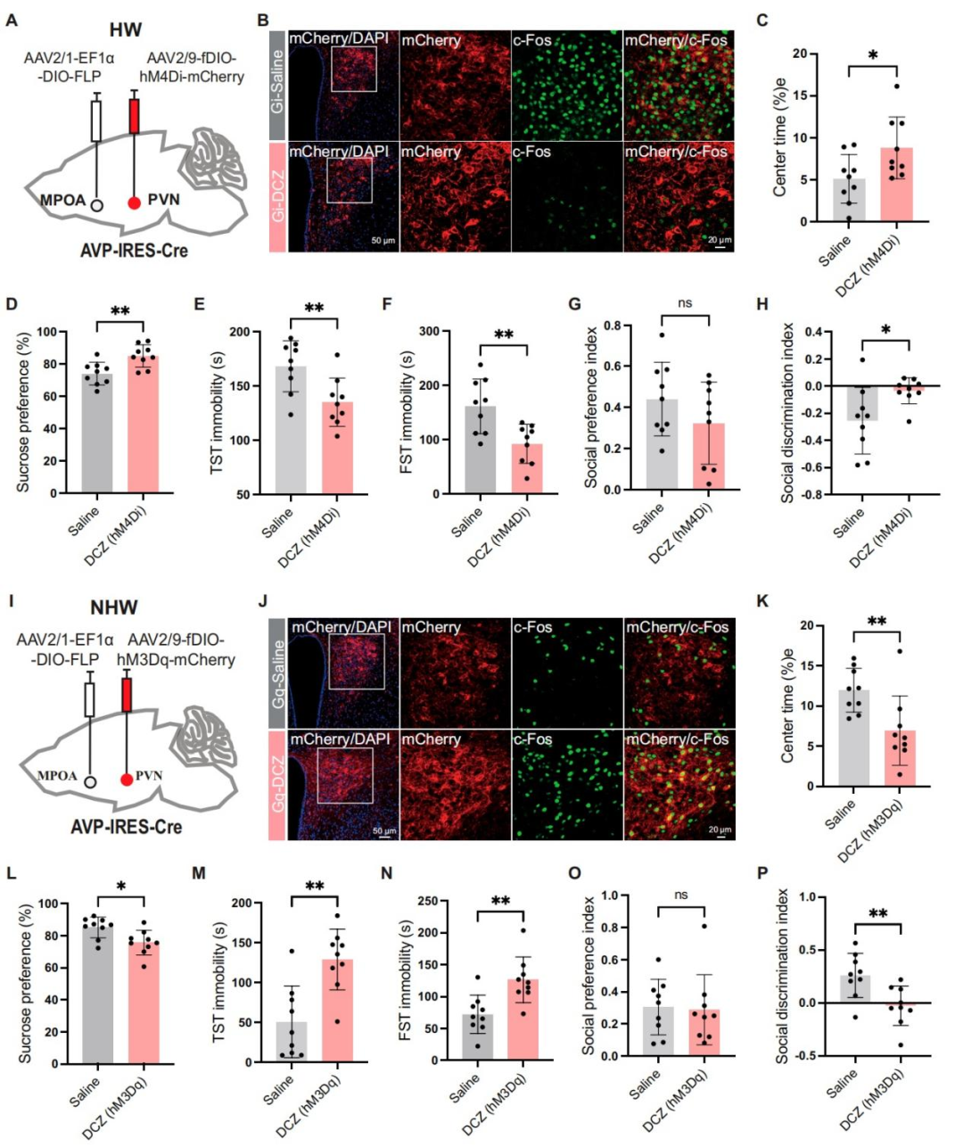 图3.化学遗传学操纵投射到PVN的MPOAGABA神经元改变了HW和NHW小鼠的抑郁样行为