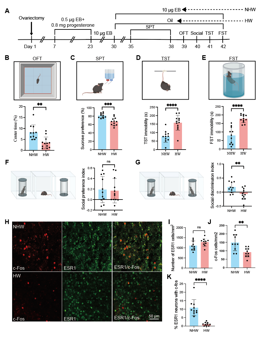 为评估MPOAESR1神经元的活性,研究人员建立了卵巢HW模型。HW小鼠表现出抑郁样行为,具体表现为:旷场实验(OFT)中央区域停留时间减少、蔗糖偏好实验(SPT)中蔗糖偏好度降低、悬尾实验(TST)和FST中不动时间增加。此外,HW小鼠的社交辨别能力受损,而社交偏好未受影响。