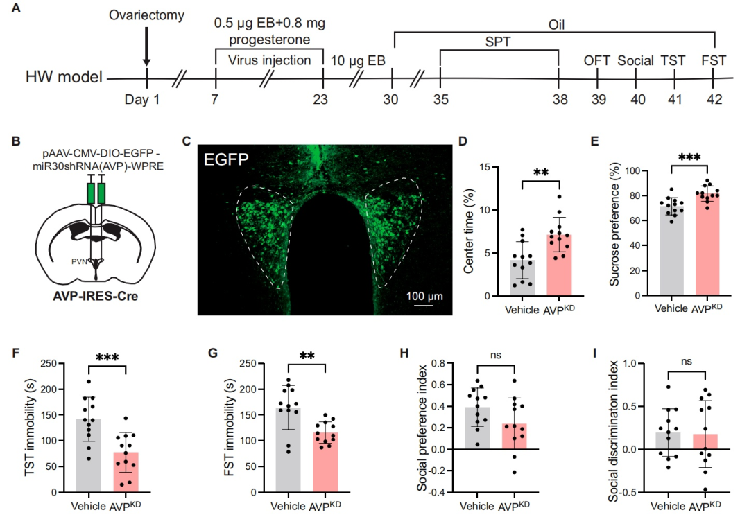 图7.敲低PVN中AVP缓解了HW小鼠的抑郁样行为