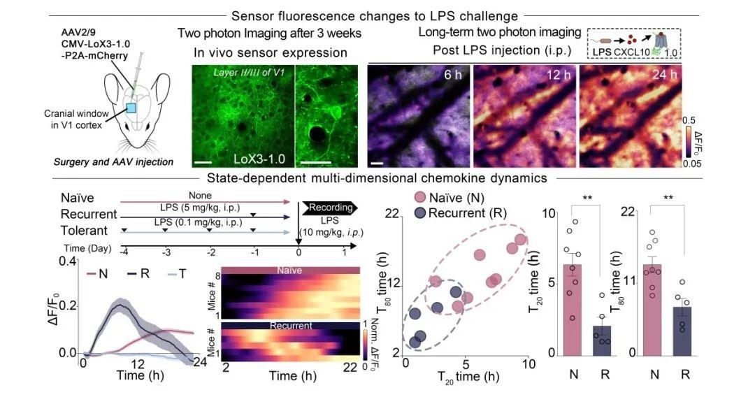 基于LoX3-1.0在体外表现出的优异性能,研究者进一步应用LoX3-1.0解析了不同免疫状态下脑内CXCL10的动态变化。持续低剂量或预先高剂量的LPS(脂多糖)刺激可促使脑内免疫状态进入特定的“耐受”或“增强”状态,而不同状态会对后续面临的相同刺激表现出截然不同的应答模式。与初次(Naïve)接受LPS处理后LoX3-1.0信号的启动延迟、强度适中的反应模式相比,复发组(Recurrent)在接受高剂量LPS二次刺激后,信号启动显著提前,响应更强烈,但在约12小时后迅速衰减,持续时间较短。而耐受组(Tolerant)在接受高剂量LPS刺激后几乎未发生明显信号上升。这些结果表明,LoX3-1.0能够在活体内捕捉与免疫状态匹配的CXCL10多维动态特征。