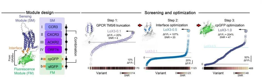 研究者基于GRAB探针的模块化原理11,构建了识别配体的感知模块和荧光报告模块,并从多种天然和病毒来源的CXCL10受体中筛选出趋化因子受体CXCR3与构象敏感荧光蛋白cpGFP的组合,作为初始骨架。通过在跨膜区、界面以及荧光蛋白内部关键位点的迭代筛选,获得了对CXCR3激动剂产生约200%响应幅度的探针LoX3-1.0。