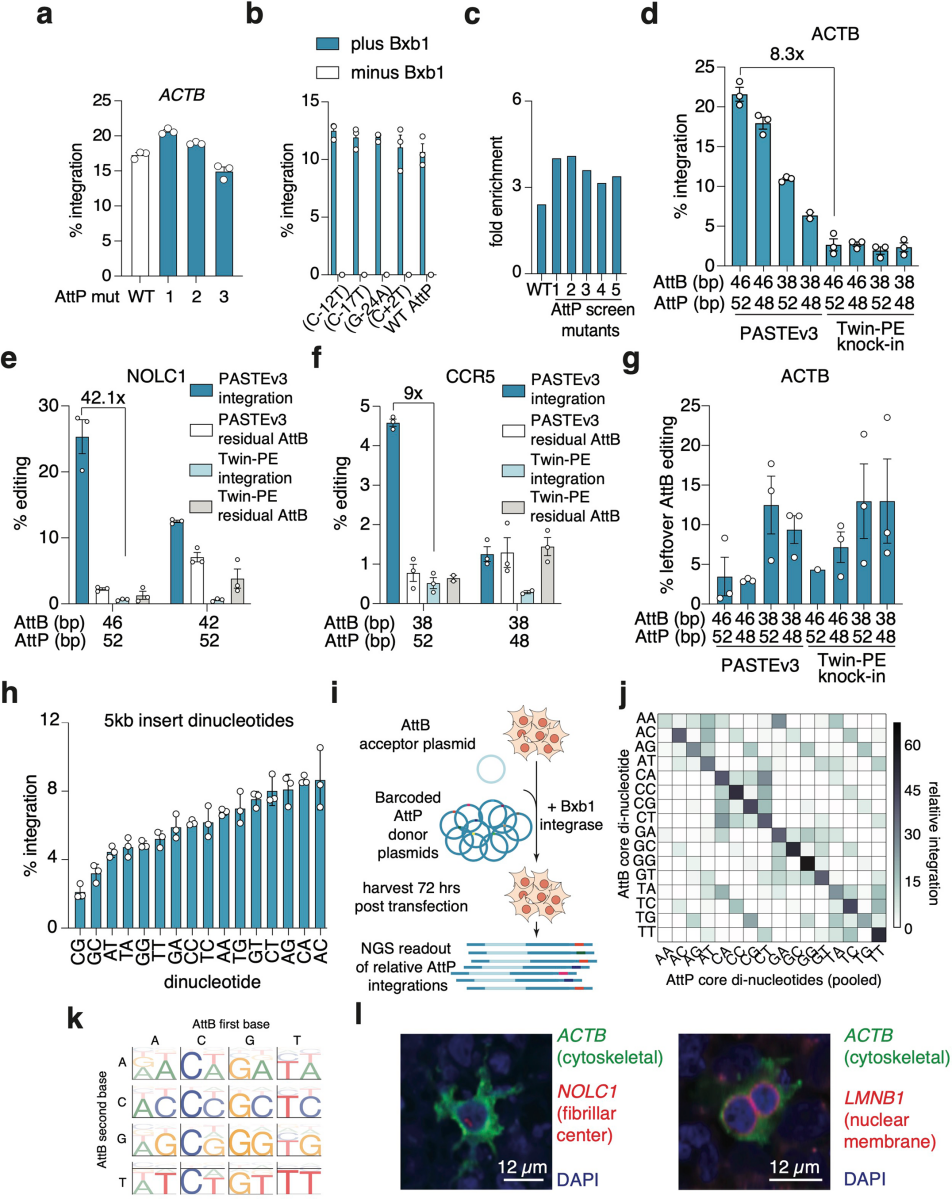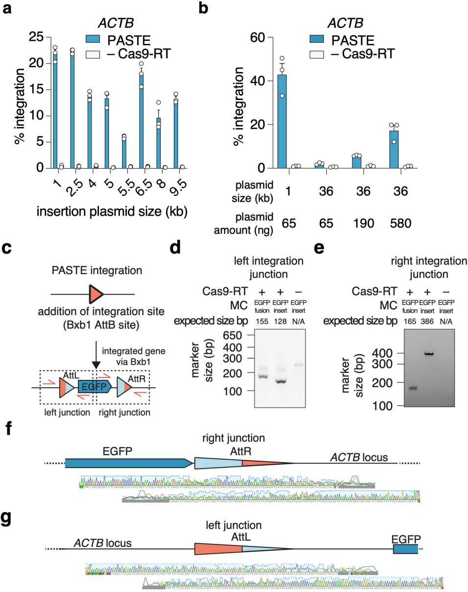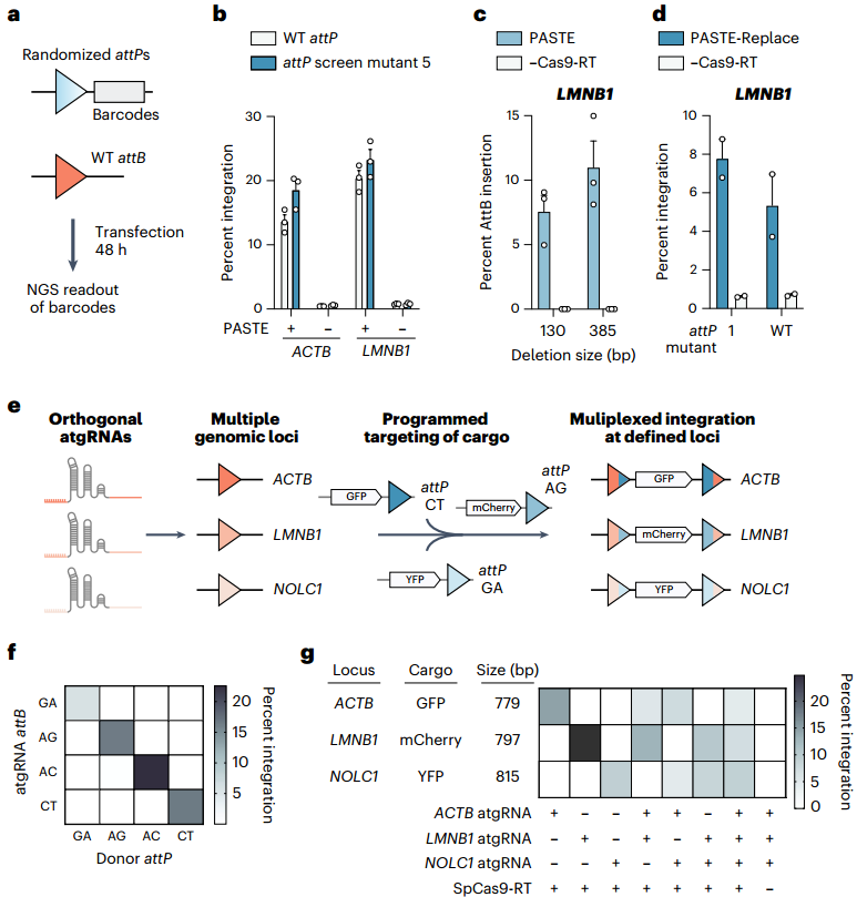 PASTE的核心设计思路是“分两步实现精准整合”:先通过先导编辑在基因组靶位点插入丝氨酸整合酶的附着位点(attB),再由整合酶将含互补位点(attP)的DNA片段整合到attB处。为实现这一过程的“单系统、高效率”,团队进行了多轮设计与优化,首先,团队验证了“先导编辑插入attB”的可行性:设计含attB序列的pegRNA(命名为atgRNA),在β-肌动蛋白(ACTB)位点成功插入长达56 bp的序列,且31 bp以下短序列插入效率更高。随后对比酪氨酸重组酶(Cre)与丝氨酸整合酶(Bxb1、TP901、phiBT1)的整合效率,发现丝氨酸整合酶效率显著更优,其中Bxb1整合酶(BxbINT)表现最佳。基于此,团队构建了初代PASTE(PASTEv1):将先导编辑载体、atgRNA、切口向导(促进链修复)、BxbINT表达载体及含GFP的969 bp微型环状DVA片段通过单次转染递送,在ACTB位点实现了约15%的GFP整合,且切口向导是最优活性的必需组件。