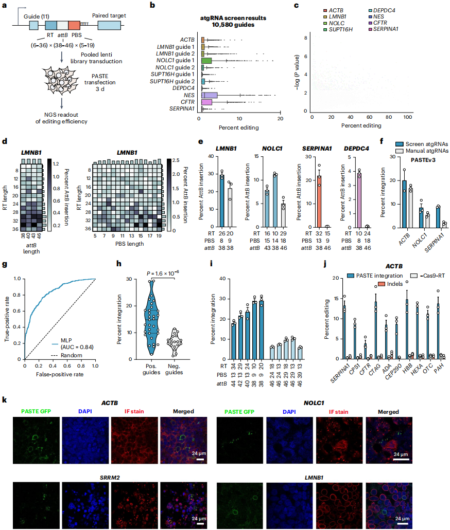 图3. 评估内源性基因组位点高效PASTE插入的设计规则