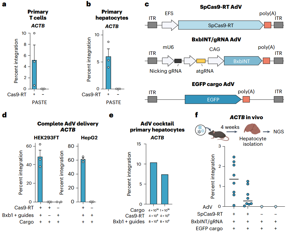 由于PASTE不依赖HDR(仅在分裂细胞活跃),团队通过阿非迪霉素处理使HEK293FT细胞停滞分裂,以测试PASTE在非分裂细胞中的活性。结果显示,PASTEv1在非分裂细胞中仍保持在ACTB位点20%以上的GFP整合效率,而HDR介导的整合则完全消失;即使插入13.3 kb的大片段,非分裂细胞中的整合效率仍大于10%,且增加DNA插入片段用量可进一步提升效率。在原代细胞中,PASTEv1在K562淋巴母细胞中的基因整合效率约为15%;在原代人T细胞中的效率约为5%;在非分裂的静息原代人肝细胞中,PASTEv1在ACTB位点的基因整合效率约为5%——这一结果打破了“大片段整合仅能在分裂细胞中进行”的限制,为体内成熟组织的基因编辑奠定基础。