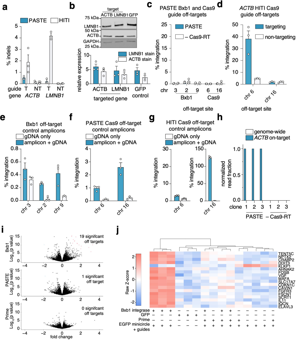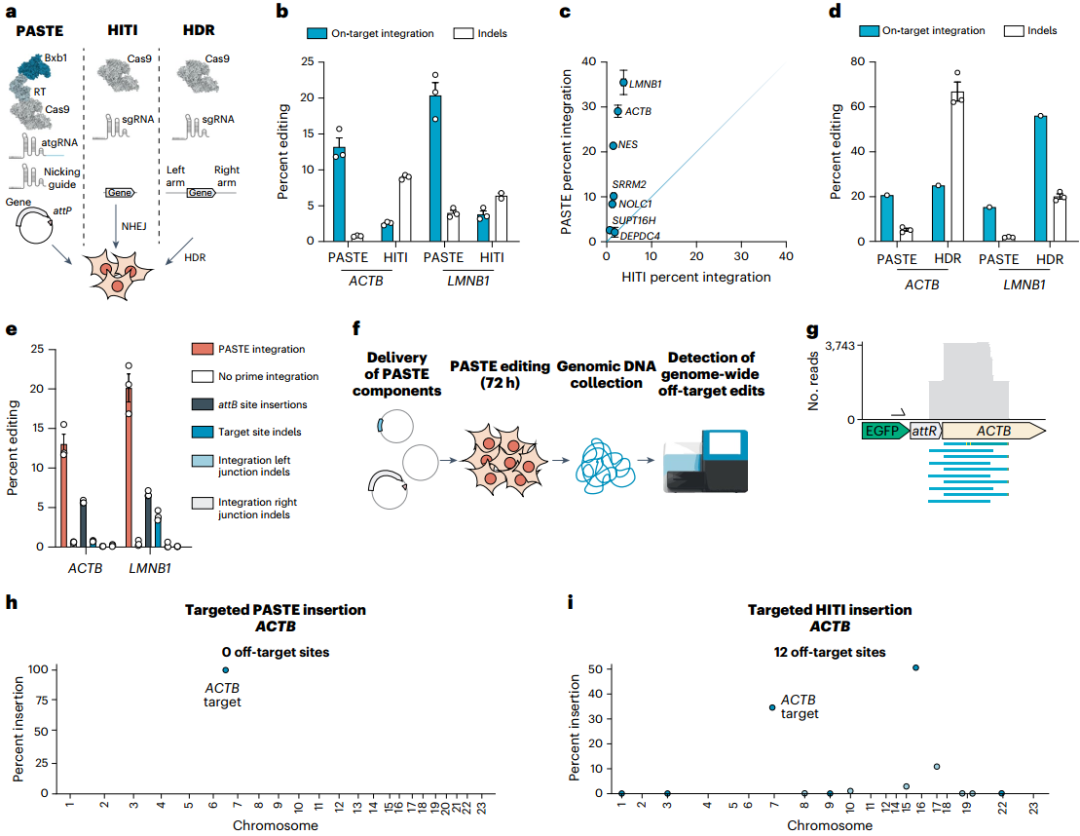 图4. 与其他整合方法相比,全基因组PASTE特异性和整合纯度的表征