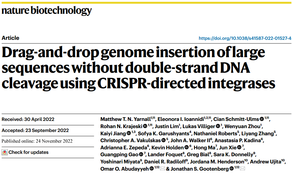 来自麻省理工学院的Jonathan S. Gootenberg教授和Omar O. Abudayyeh教授团队在Nature Biotechnology期刊发表了题为“Drag-and-drop genome insertion of large sequences without double-strand DNA cleavage using CRISPR-directed integrases”的文章,开发了一种名为“可编程位点特异性靶向元件添加(programmable addition via site-specific targeting elements,PASTE)”的新型基因组编辑技术。该技术创新性地将CRISPR-Cas9切口酶、逆转录酶(RT)与丝氨酸整合酶融合,构建出一套无需DSB即可实现大片段DNA整合的系统:通过先导编辑将整合酶的“附着位点(attB)”精准插入基因组靶标,再利用融合的丝氨酸整合酶将含互补位点(attP)的环状DNA片段高效整合。研究证实,PASTE可在3种人类细胞系、原代T细胞及非分裂原代人肝细胞中,于多个基因组位点实现长达约36 kb片段的整合;其效率与HDR、NHEJ方法相当或更高,不仅能在非分裂细胞中发挥作用,还可在体内应用,且可检测到的脱靶事件更少。此外,团队还对PASTE技术进行了一系列的优化。作为基因组编辑领域的新一代工具,PASTE为生物医学研究及治疗开发中的基因插入与标记需求开辟了多元化的应用方向。