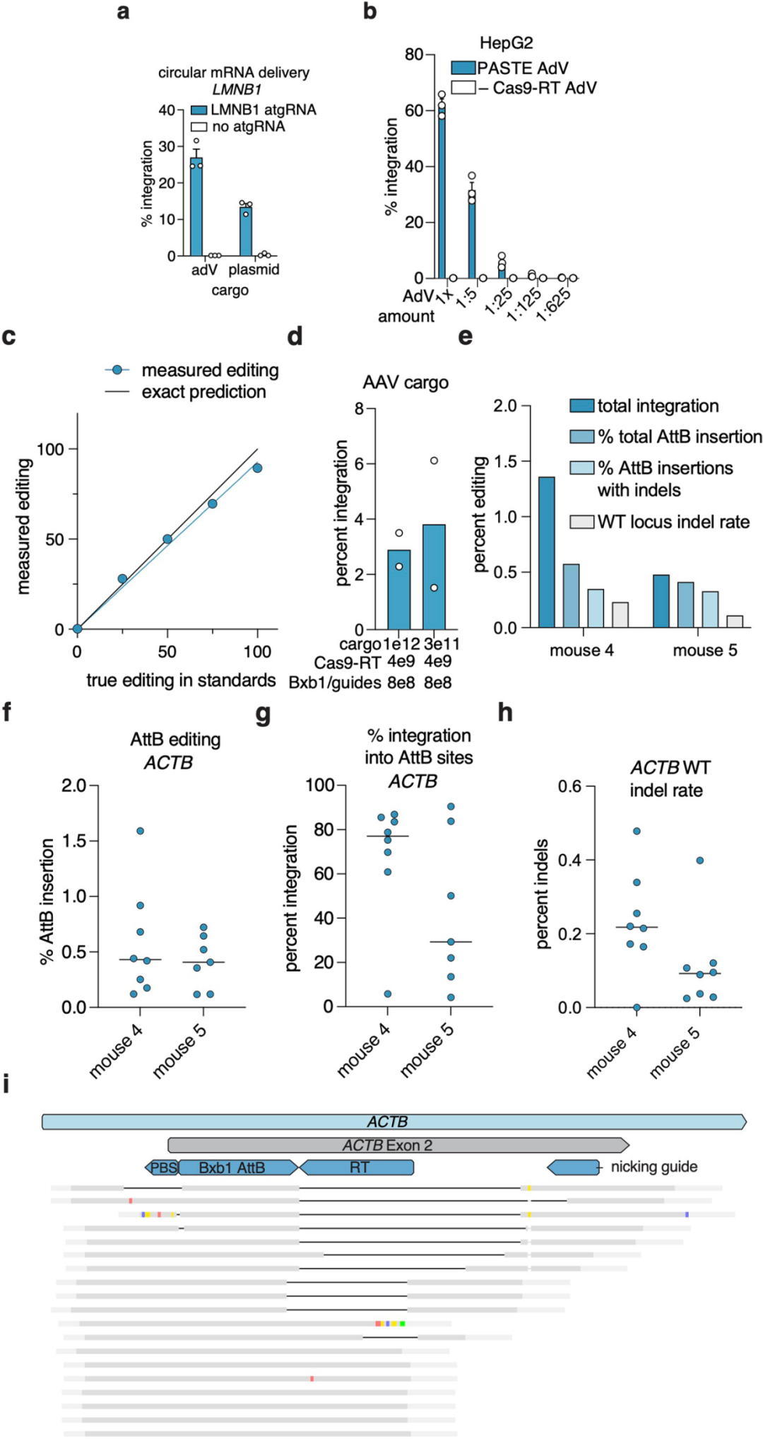 为推动PASTE的临床转化,团队测试了“病毒递送系统”的兼容性:通过腺相关病毒(AAV)递送含attP的片段时,整合效率呈剂量依赖性(4%-10%);腺病毒(AdV)递送36 kb的EGFP片段时,在HEK293FT、HepG2细胞中的效率达10%-20%。为进一步验证PASTE适用于体内递送,团队开发了PASTEv1蛋白组件的mRNA形式,及针对LMNB1靶位点的化学修饰合成atgRNA与切口向导。将这些mRNA与向导RNA进行电穿孔,同时用AdV或质粒递送模板,最终实现高达约20%的整合效率。团队推测,更持久的BxbINT表达有助于整合到基因组中新导入的attB位点,遂测试环状mRNA表达系统,发现其可将整合效率提升至约30%。为进一步优化递送策略,团队将完整PASTE系统(包括Cas9-RT融合蛋白、整合酶、引导RNA及外源片段)分别包装到三种AdV载体中(如图11c)。结果显示,在HEK293FT和HepG2细胞中,仅通过病毒递送即可实现高达约50%-60%的整合效率;在原代人肝细胞(PXB细胞)中,该系统的效率达10.5%(呈片段依赖性),使用AAV模板时整合效率可达3.8%。