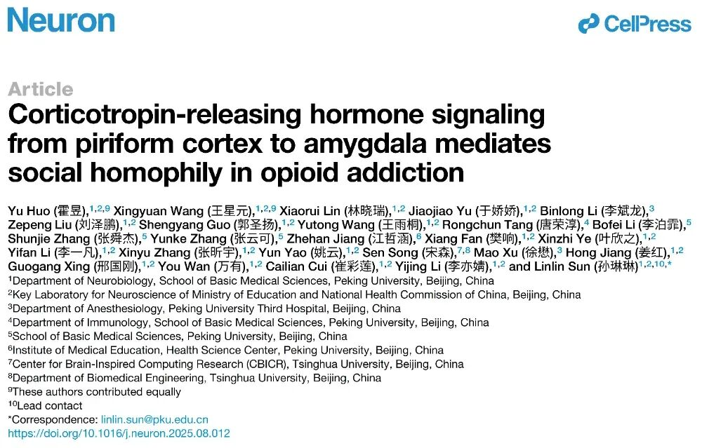 2025年9月12日,北京大学基础医学院神经生物学系孙琳琳研究员课题组在Neuron期刊(IF=15)在线发表了题为“Corticotropin-releasing hormone signaling from piriform cortex to amygdala mediates social homophily in opioid addiction”的研究论文。在这项工作中,研究人员通过建立吗啡依赖和戒断模型,首次发现阿片类药物成瘾个体在选择社交伙伴时存在显著的社交同质性偏好,结合多感官行为及功能鉴定、c-Fos全脑筛选、病毒示踪、光遗传、化学遗传、钙成像、基因敲除和脑片电生理等方法,明确了该社交同质行为是由喙侧梨状皮层(APIR)的促肾上腺皮质激素释放激素(CRH)阳性神经元激活,导致CRH神经肽释放并传导至基底内侧杏仁核(BMA),经由CRHR1和CRHR2受体介导社交趋近动机增加,进而诱发社交同质相吸。