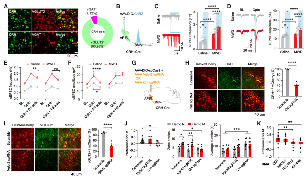 作者进一步探究了APIR神经元的下游投射通路。通过全脑病毒示踪技术发现,APIR神经元向基底内侧杏仁核(BMA)、基底外侧杏仁核(BLA)、终纹床核(FS)及伏隔核(NAc)四个脑区发出密集投射。利用化学遗传学方法分别特异性抑制以上四条通路后发现,只有在抑制APIR→BMA通路时,吗啡戒断小鼠之间的社交同质相吸行为被显著阻断。进一步的免疫荧光染色结果显示,在吗啡戒断小鼠发生社交同质相吸行为时,APIR脑区中CRH阳性神经元被显著激活,且该类神经元共表达谷氨酸能标志物囊泡谷氨酸转运蛋白2(VGLUT2)。以上结果表明,APIR→BMA通路在介导该社交同质相吸行为中起到关键作用,且这一过程伴随APIR内CRH阳性神经元的特异性激活。