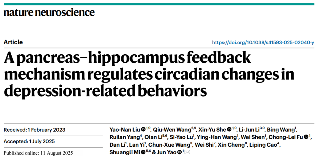 2025年8月11日,清华大学生命科学学院、清华-IDG/麦戈文脑科学研究院姚骏研究员课题组在Nature Neuroscience期刊(IF=28.771)在线发表了以“A pancreas-hippocampus feedback mechanism regulates circadian changes in depression-related behaviors”为题的研究论文。该研究探讨了胰腺RORβ和胰岛素分泌缺陷在BD中的作用。作者发现,BD患者的血浆和诱导多能干细胞(iPSC)衍生的胰岛样类器官中RORβ表达升高,而脑样本中无此现象,且这种上调会损害胰岛素分泌。利用CRISPR激活(CRISPRa)技术,特异性促进小鼠胰腺中RORβ的表达,会在光相诱发抑郁相关行为,在暗相诱发躁狂样行为。机制上,RORβ上调会在光相抑制胰岛素释放,导致海马过度活跃和抑郁样行为。这种海马过度活跃随后以延迟但持续的方式,在暗相触发胰岛素分泌过多,进而导致神经元活动减弱和躁狂样行为。这些效应通过电生理学、化学遗传学和光遗传学方法得到了证实。以上研究结果揭示了一种胰腺-海马反馈机制,通过该机制,代谢因素和昼夜节律因素共同作用,导致情绪障碍。