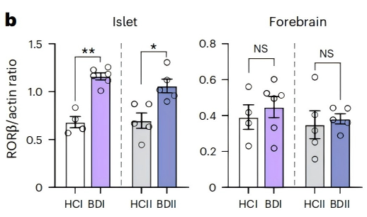 进一步研究显示,BD患者血浆及iPSC衍生的胰岛样类器官中,参与昼夜节律调控的转录因子RORβ表达显著升高;而BD患者iPSC衍生的前脑类器官、DG神经元及尸检前脑样本中,RORβ的表达则无明显异常。