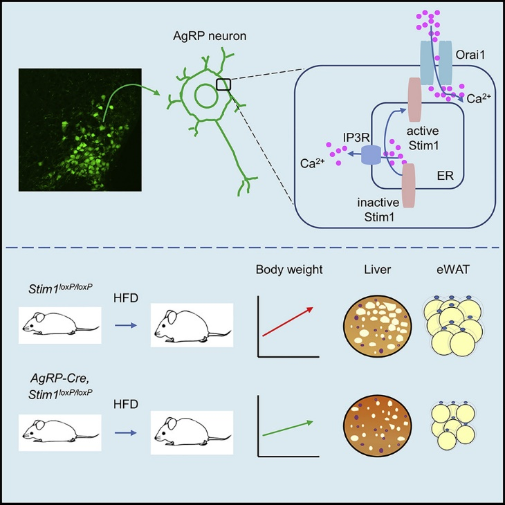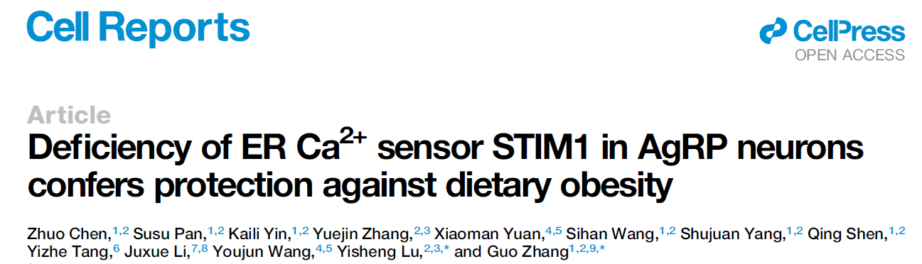 2021年10月19日,华中科技大学同济医学院公共卫生学院张果教授团队与吕义晟教授团队合作在Cell Reports发表了题为“Deficiency of ER Ca2+ sensor STIM1 in AgRP neurons confers protection against dietary obesity”的研究论文,揭示了SOCE和Stim1在中枢调控饮食诱导的肥胖形成的一个新的机制。