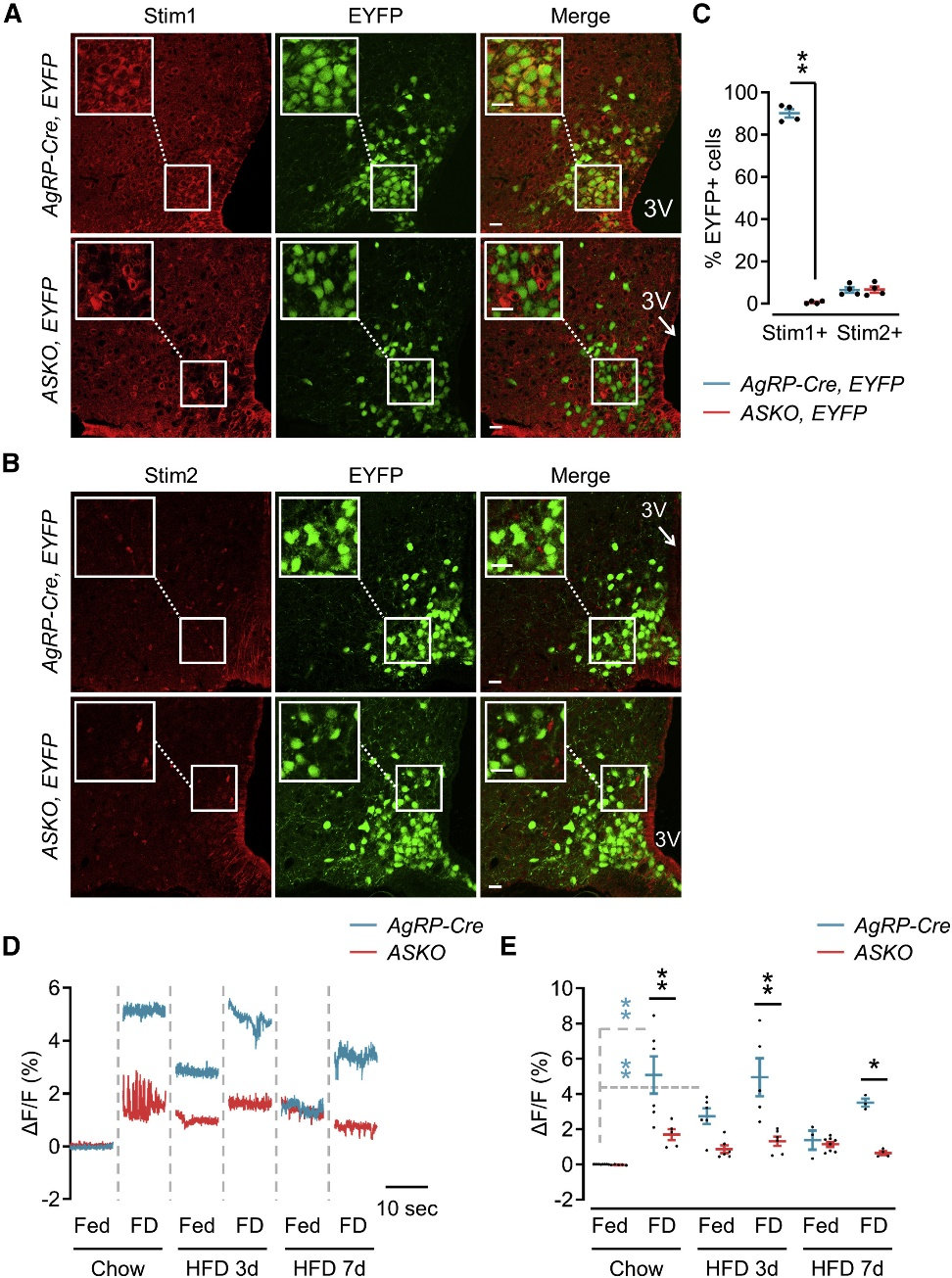 在本研究中,课题组首先通过小鼠第三脑室中枢给予SOCE抑制剂,发现抑制SOCE可缓解高脂食物饲养导致的小鼠体重过度增加。此外,Stim1(Stromal interacting molecule 1)是SOCE的关键组成分子,也是内质网钙离子浓度的感应分子。然后,将Cre重组酶诱导的rAAV-EF1a-DIO-GCaMP6m-WPRE-hGH-polyA(BrainVTA, Wuhan, China)病毒分别注射到AgRP-Cre小鼠和AgRP神经元Stim1敲除小鼠的下丘脑弓状核并进行活体钙成像实验,发现Stim1的缺失减弱了过夜禁食引起的AgRP神经元内钙离子浓度的增加(图2)。