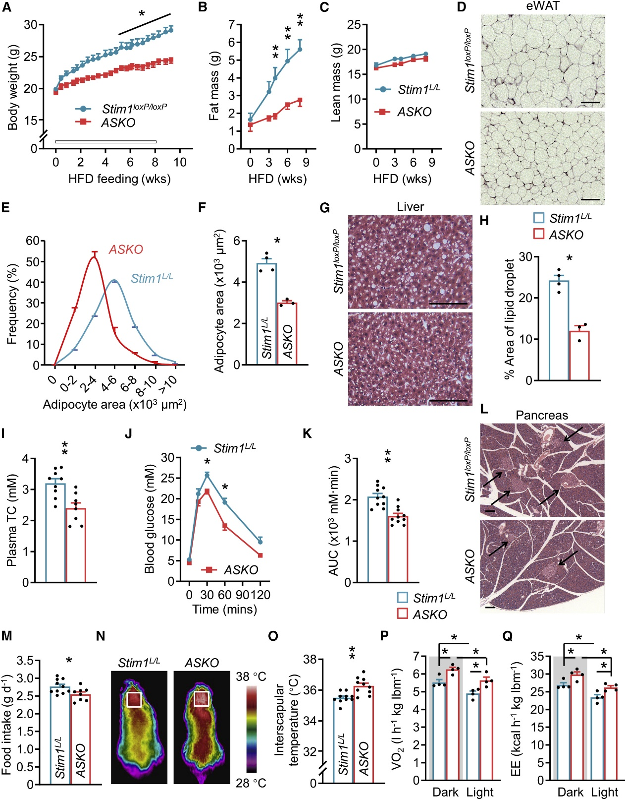 然后针对AgRP神经元Stim1敲除是否对高脂食物饲养小鼠的能量代谢产生影响进行测量分析,发现敲除组小鼠能够对高脂食物诱导的肥胖产生抵抗,其肥胖相关的糖脂代谢异常也得到改善(图3)。