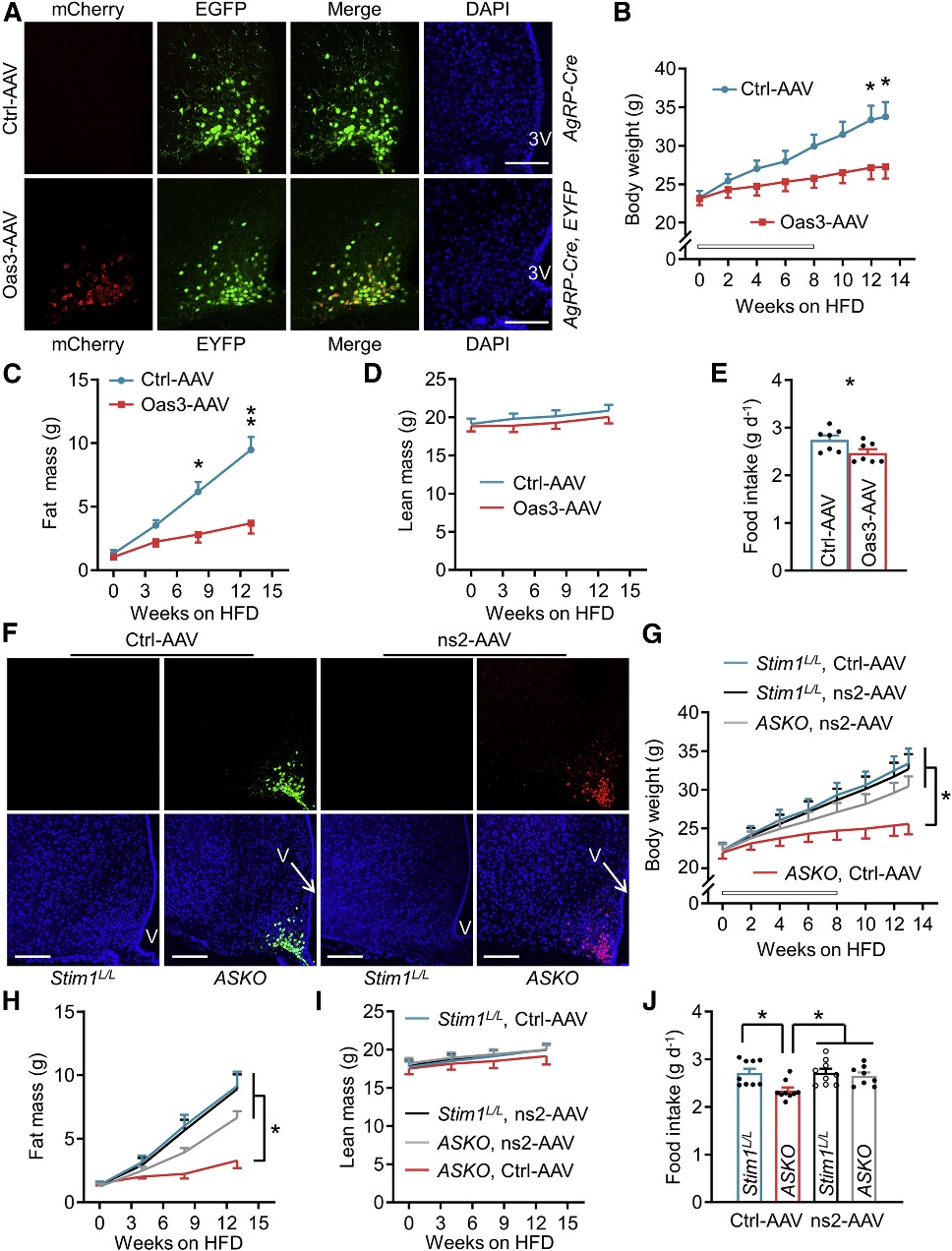 图1. 下丘脑AgRP神经元中的Stim1-Oas3信号传导通路在小鼠营养性肥胖形成中的作用
