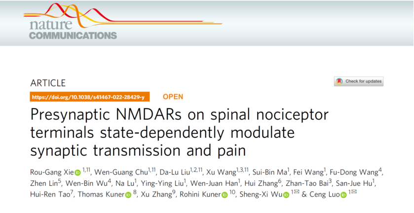 2022年2月,空军军医大学基础医学院罗层教授和武胜昔教授团队在国际知名期刊Nature Communications(IF=14.919)在线发表了题为“Presynaptic NMDARs on spinal nociceptor terminals state-dependently modulate synaptic transmission and pain”的研究论文。