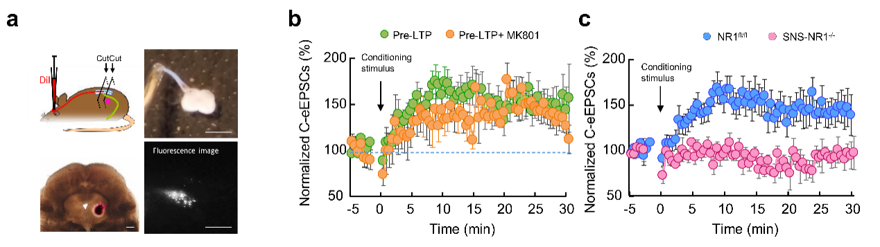 在这篇文章中,作者利用在中脑导水管周围灰质(PAG)区域注射DiI逆行标记脊髓背角I层投射神经元,全细胞膜片钳记录标记神经元,给予背根2 Hz 240 times条件刺激,可以在突触后神经元被钳制在-70 mV及应用MK801阻断突触后神经元NMDA受体的情况下,诱发突触前长时程增强(presynaptic long-term potentiation,preLTP)。应用SNS-NR1-/-小鼠进一步证明,该preLTP主要由伤害性感受器PreNMDARs介导。