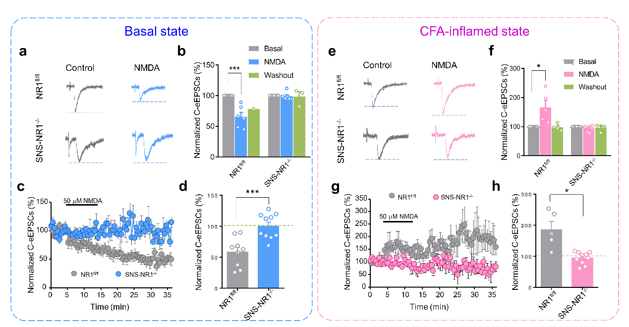 那么,外源性NMDA作用于伤害性感受器PreNMDAR产生怎样的作用呢?研究发现,在生理状态下外源性给予NMDA(50μM,30 s)显著抑制生理状态NR1fl/fl动物脊髓背角初级传入突触的eEPSCs(诱发的兴奋性突触后电流)(图2a-b),PPR分析进一步证明伤害性感受器末梢PreNMDARs的激活通过突触前机制抑制了基础状态下的谷氨酸释放。通过在动物单侧足底注射完全弗氏佐剂(CFA)产生慢性炎性痛模型,进而研究病理状态下PreNMDARs的作用,研究发现在病理状态下,外源性NMDA(50μM,30 s)则明显增强NR1fl/fl动物脊髓背角突触eEPSCs(图2e-f)。上述效果均在SNS-NR1-/-小鼠中被显著阻断。这一结果提示伤害性感受器PreNMDARs以状态依赖性的方式调节突触传递,在基础状态下抑制突触传递,而在病理状态下则易化突触传递。