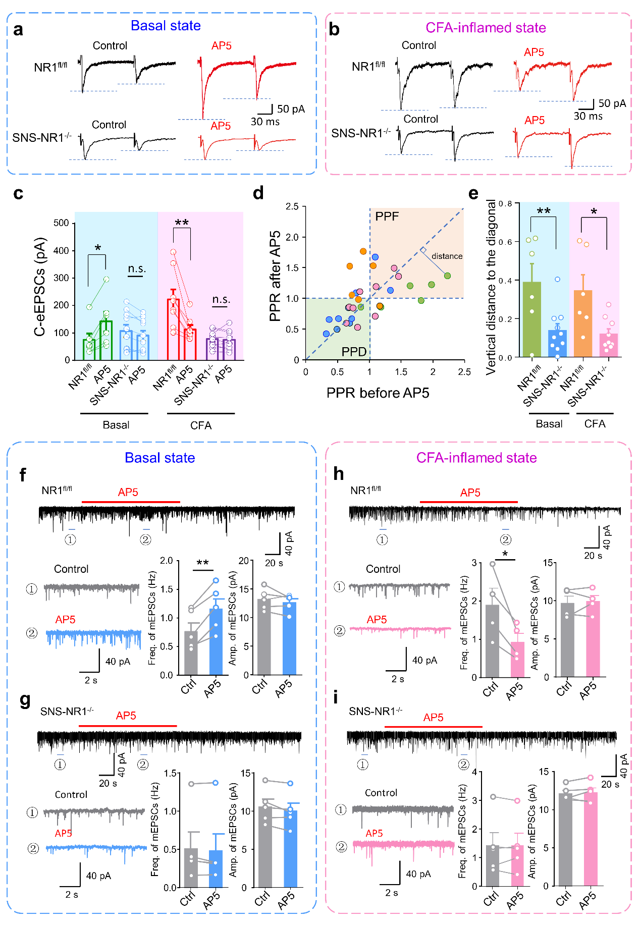 为了进一步明确PreNMDARs对突触前传递的状态依赖性调节,作者进一步阻断内源性PreNMDARs来研究不同状态下的突触传递。研究发现,应用AP5(竞争性NMDA受体拮抗剂)阻断PreNMDARs,在基础状态下导致C-eEPSC增强,而在病理状态下则导致C-eEPSC减弱(图3a-c)。以上结果通过mEPSCs(微小兴奋性突触后电流)实验进一步证实,在基础状态下,灌流AP5可以增强mEPSCs的频率;而在病理状态下,则减弱mEPSCs的频率(图3f-i)。