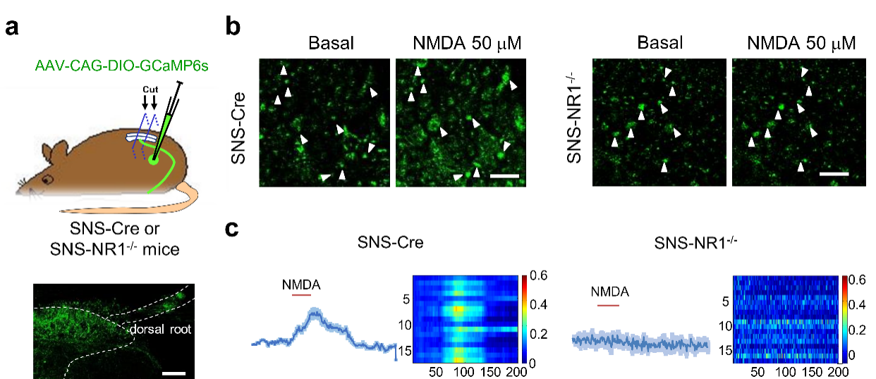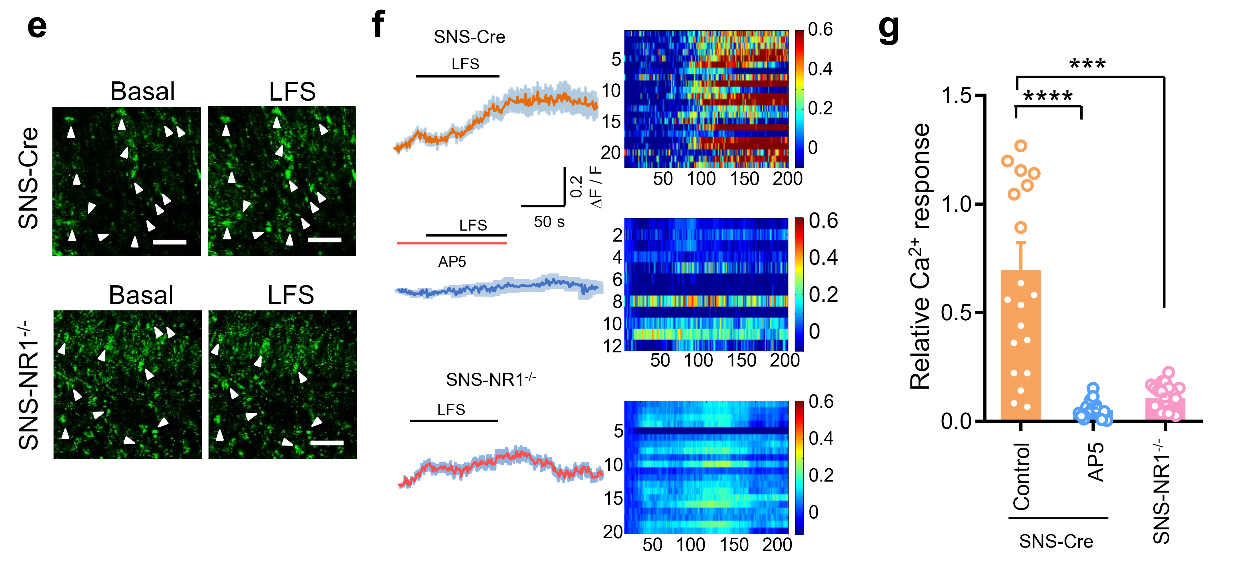为了进一步验证PreNMDARs在伤害感受器脊髓末梢的功能,实验室通过在突触前特异性表达Ca2+探针的方法研究PreNMDARs的功能。将含有Cre依赖的GCaMP6s的AAV2/8载体病毒注射到SNS-Cre和SNS-NR1-/-小鼠的DRG(背根神经节)中,在病毒注射4-6周后进行成像实验。结果表明外源性给予NMDA通过激活PreNMDAR诱致伤害性感受器中枢突末梢突触前钙信号显著增强。同样,通过背根刺激也可以诱发突触前的钙信号增强,并且这种增强作用可以被AP5阻断,通过SNS-NR1-/-动物研究,证明突触前钙信号的增强主要依赖于PreNMDARs(图4)。