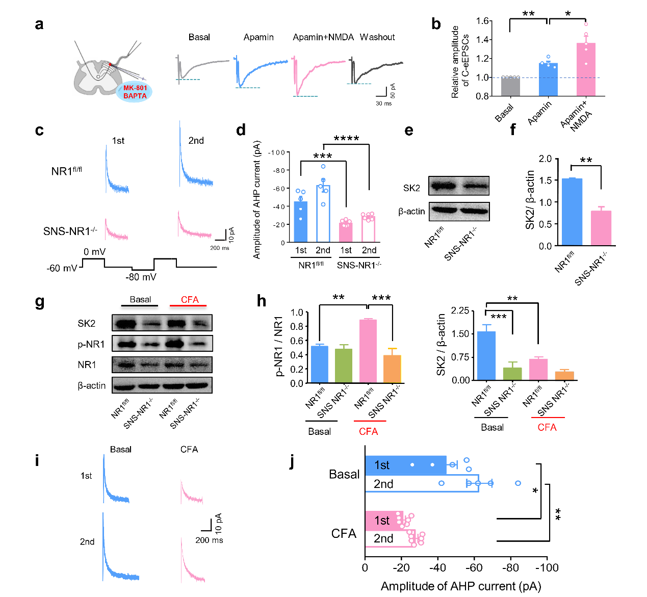那么,为什么伤害性感受器PreNMDARs在不同的状态下对突触可塑性产生不同的作用呢?实验室研究发现,小电导Ca2+激活的K+(SK)通道参与PreNMDARs介导的基础状态下的突触抑制。应用SK通道阻断剂Apamin抑制SK通道,可以导致C-eEPSCs显著增强,并且与外源性NMDA有协同作用。进一步应用转基因动物发现SNS-NR1-/-小鼠的SK相关电流显著降低。结合Western blot实验联合提示伤害性感受器突触前SK2通道的激活参与了PreNMDAR在基础状态下的脊髓突触前抑制作用。那么,PreNMDAR又如何促进炎症性疼痛状态下的脊髓突触传递呢?实验室首先验证了炎性痛状态下NMDAR和SK2通道活性的变化。在CFA注射24小时后,与基础状态相比,NR1fl/fl小鼠DRG中的NMDARs NR1亚基磷酸化水平显著上调。DRG神经元中的SK相关电流在CFA炎性痛小鼠中显著减弱,SK2通道的表达水平显著下调。