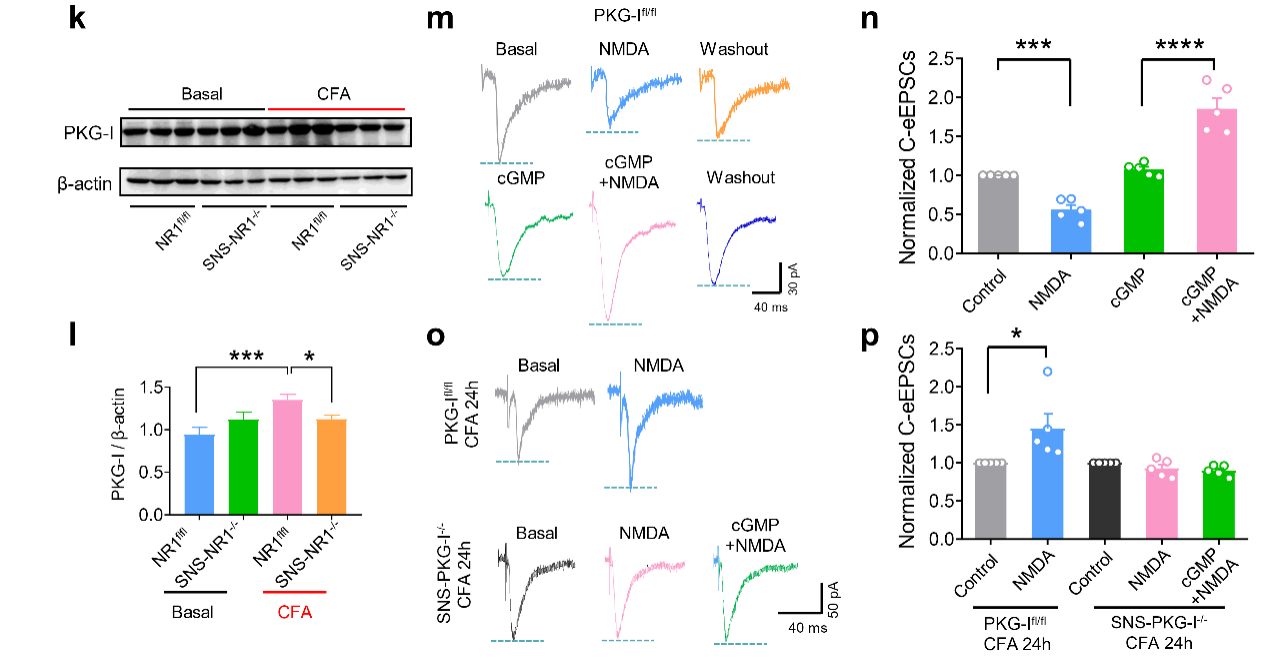 那么炎性痛后脊髓背角突触前SK通道下调的可能原因是什么?大量研究表明脊髓NMDA受体-NO-cGMP通路在突触可塑性和慢性疼痛发展中发挥关键作用。据报道,cGMP依赖性蛋白激酶I(PKG-I)在伤害性初级感觉神经元中高表达。实验室研究发现伤害性感受器的持续激活导致DRG中NMDARs-PKG-I信号通路的显著激活。