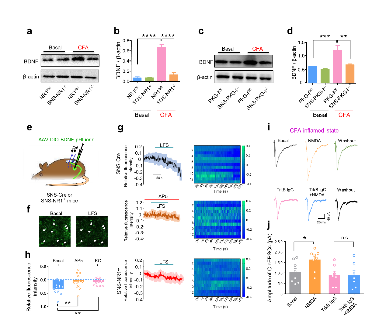 那么,PKG-I介导PreNMDAR状态依赖性改变的下游潜在靶点是什么?实验室研究表明,CFA后BDNF(脑源性神经营养因子)显著增高,这种效应在SNS-NR1-/-小鼠中显著降低。并且结合Cre动物及AAV-DIO-BDNF-pHluorin系统检测突触前BDNF的释放,研究发现,AP5可以显著抑制NR1fl/fl小鼠的突触前BDNF的释放,并且SNS-NR1-/-小鼠突触前BDNF的释放显著降低。