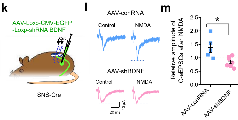 为了进一步评估BDNF在病理状态下对PreNMDARs介导的突触增强作用,实验室构建BDNF shRNA,应用Cre-loxp技术将BDNF shRNA注射入L3背根神经节中,研究表明,在敲减伤害性感受器BDNF后,外源性NMDA介导CFA后的C-eEPSCs增强被显著抑制。