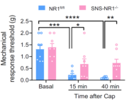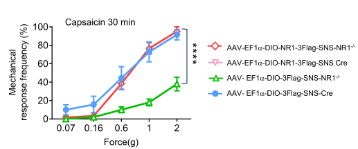 进一步行为学研究显示,与NR1fl/fl小鼠相比,辣椒素诱导的继发性痛敏在SNS-NR1-/-小鼠显著降低。实验室构建了Cre依赖的AAV2/8表达flag标签的NR1 cDNA进行挽救实验,将病毒注射入小鼠DRG表达,与SNS-cre小鼠相比,SNS-NR1-/-小鼠显著恢复了对辣椒素的机械性痛敏。