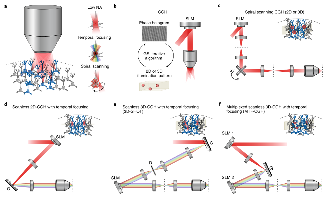 双光子激光扫描显微镜可以成像数千个神经元的活动,在动物的一些行为中可能需要大量的神经元共同激活,因此使用双光子全息光遗传学进行研究有很大优势。同时控制一个全息范围内的的神经元数量有两个限制因素:视蛋白的效率和激光的功率。将多个高能激光器件组合到一个显微镜中能提高激光功率,但会导致脑区局部温度过高。因此,优化视蛋白是增加控制神经元集合的有效方式。