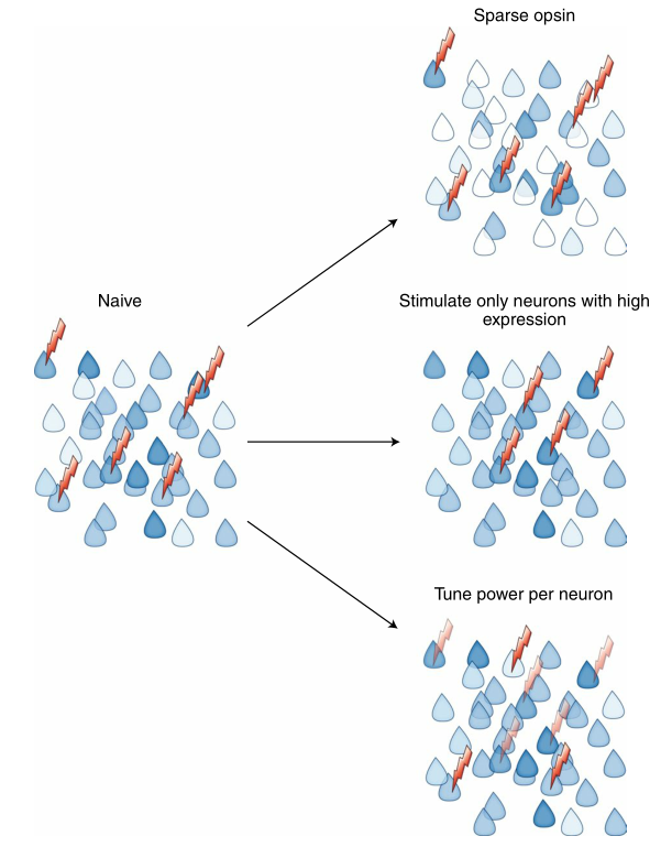 实现单细胞尺度的绝对精确度还有几个必须考虑的问题:在目标神经元胞体上(而不是突触)表达视蛋白来驱动动作电位、神经元在脑实质中的密度,细胞间视蛋白表达的异质性,以及相似亚型的神经元之间兴奋性的异质性。