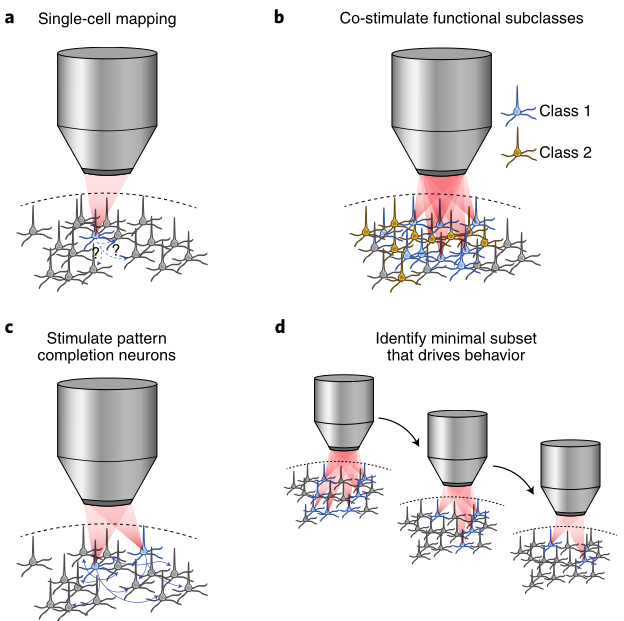 近期大多数全息光遗传学关注于神经元集合的研究中,研究人员可根据神经元对感觉或认知特征的共同反应进行分类,进而全息成像同一共同特征的神经元集合。此外,研究人员还计算分析神经元的生理数据,进而将神经元进行分类。对同一类型神经元的最小集合进行光遗传学干预,进而确定引起行为学效应的最小神经元集合。